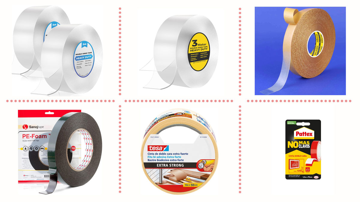 Una cinta adhesiva de doble cara sirve para pegar determinados objetos en superficies lisas, como paredes y suelos, sin necesidad de taladrar o hacer agujeros. Cuentan con un pegamento extrafuerte que permite colocar marcos de fotos, espejos o carteles en la pared de forma fácil y sencilla. También puede usarse para fijar la ubicación de una alfombra al suelo y que no se mueva cada vez que la pises.