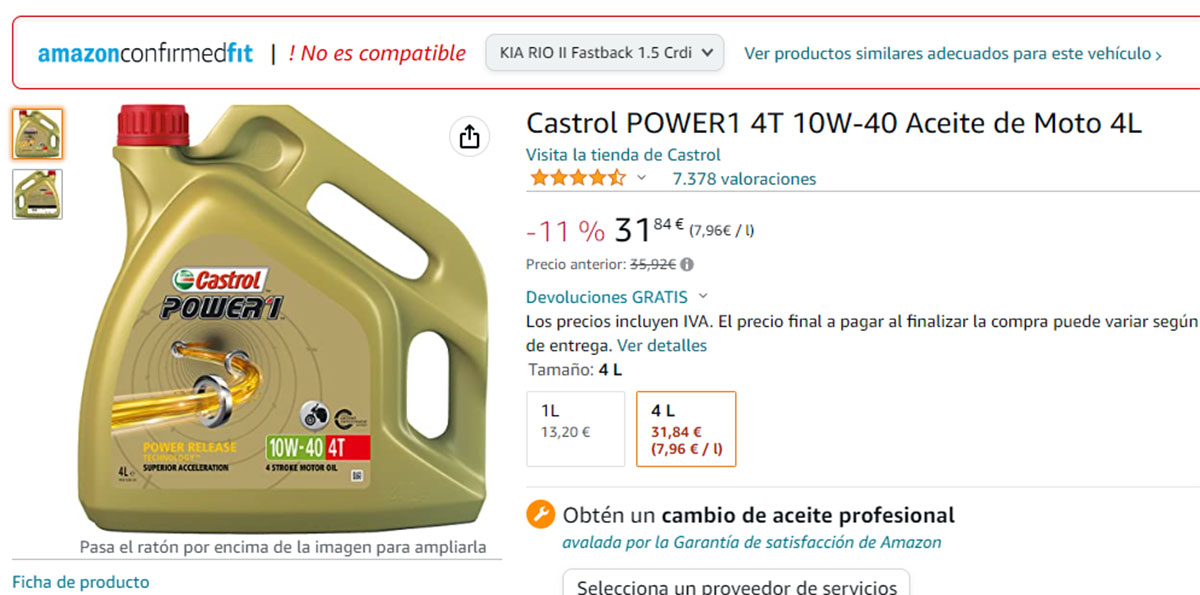 - Compatibilidad del aceite con la moto que tienes. Cada tipo de aceite está específicamente diseñado para un motor y tipo de moto concreta. Motivo por el que este es el aspecto más importante a la hora de decidir qué aceite para la moto comprar. En las especificaciones de cada uno de los productos aparece detallado un listado con los distintos modelos de motos con los que es compatible. Pero si quieres asegurarte de la compatibilidad, puedes consultarlo en la web de Amazon.