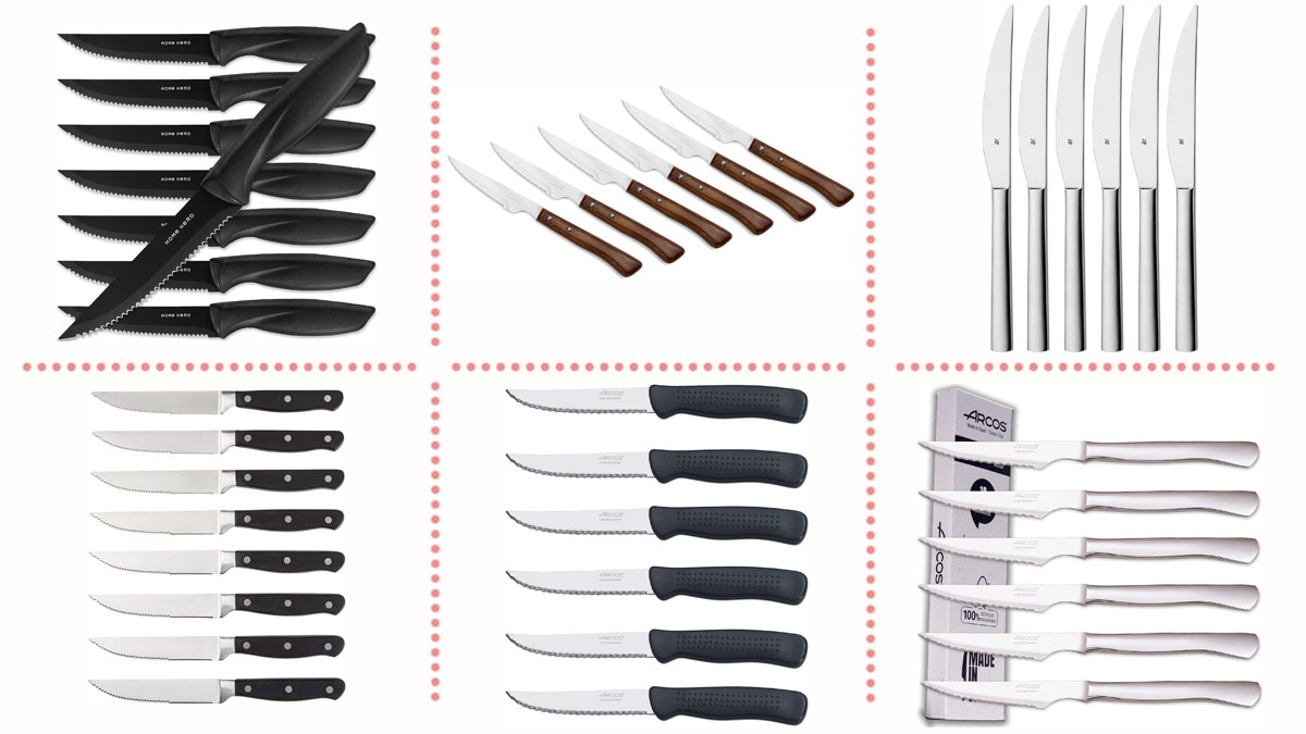 Cuchillos chuleteros. Este conjunto de 6 cuchillos de la maraca Arcos es uno de los que mejor relación calidad-precio tienen en Amazon. Tienen una hoja de 110 milímetros con sierra. Ideales para cortar la carne sin esfuerzo y sin estropear el producto.