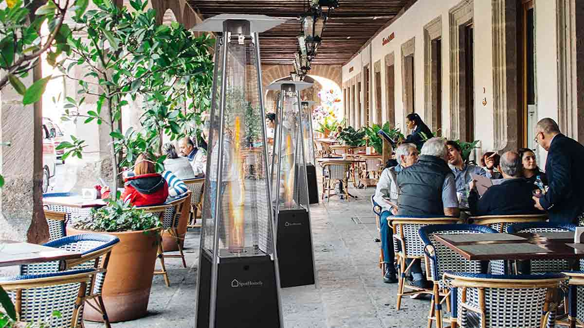 Para el jardín, para las terrazas de bares y restaurantes con zonas climatizadas, estas estufas de gas de sombrilla, colgantes o con forma de pirámide son ideales. Las estufas pirámide son ideales para colocar en las terrazas como las que podemos ver en los bares: