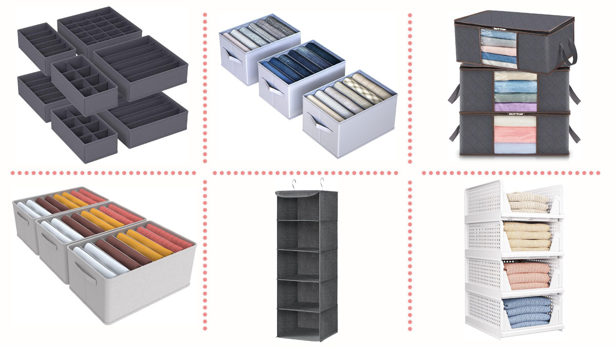 Están específicamente diseñados para crear espacios de almacenamiento adicionales a los que ya se incorporan en los armarios para tener toda la ropa colocada y con un sistema de fácil acceso. Los hay colgantes, verticales, que se apilan, de tela o plástico, con asas para transportarlos y hasta con tapa para cerrarlos.