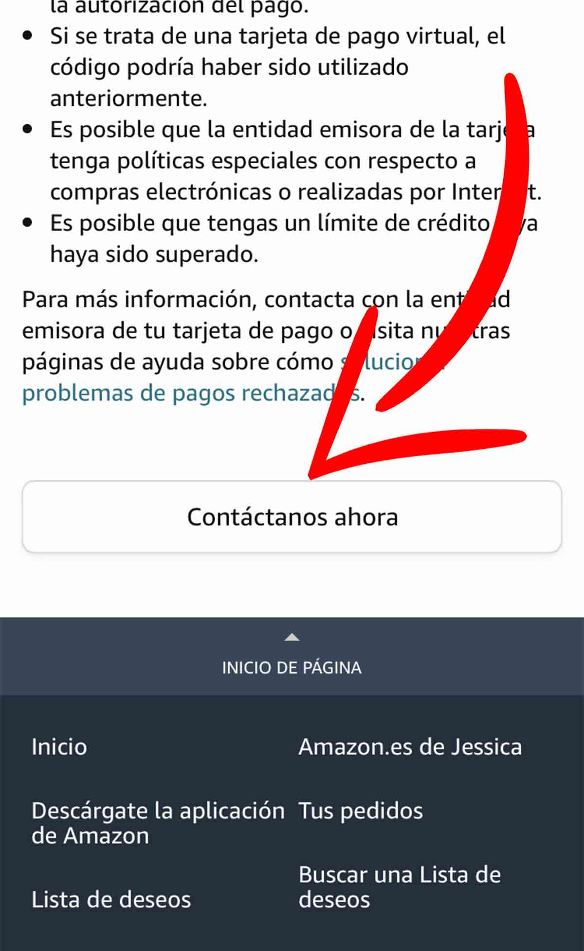 Después de seleccionar la opción ‘Pago rechazado’ y antes de poder establecer contacto con los empleados, aparece una pantalla explicativa con las posibles causas que han podido provocar este problema, por si esa información puede ayudar a resolver la duda. En caso de que no sea así y quieras hablar con el servicio de atención al cliente, tienes que darle al botón que se encuentra al final de la página que dice ‘Contáctanos ahora’.