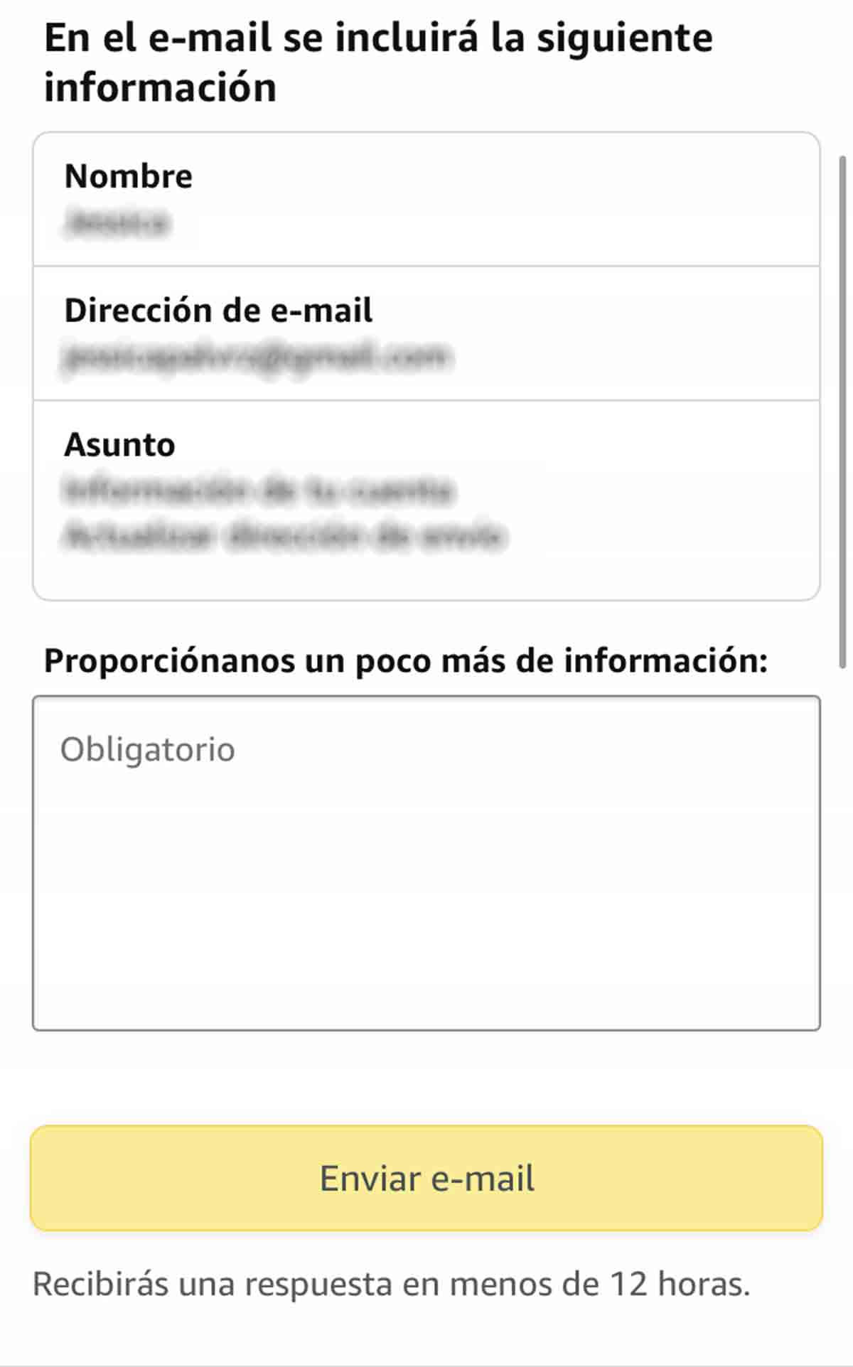 - Si seleccionas la opción correo electrónico, tendrás que completar un formulario, como el que aparece en la imagen, explicando cuál es tu duda o problema y los técnicos te responderán en un plazo máximo de 12 unas horas.