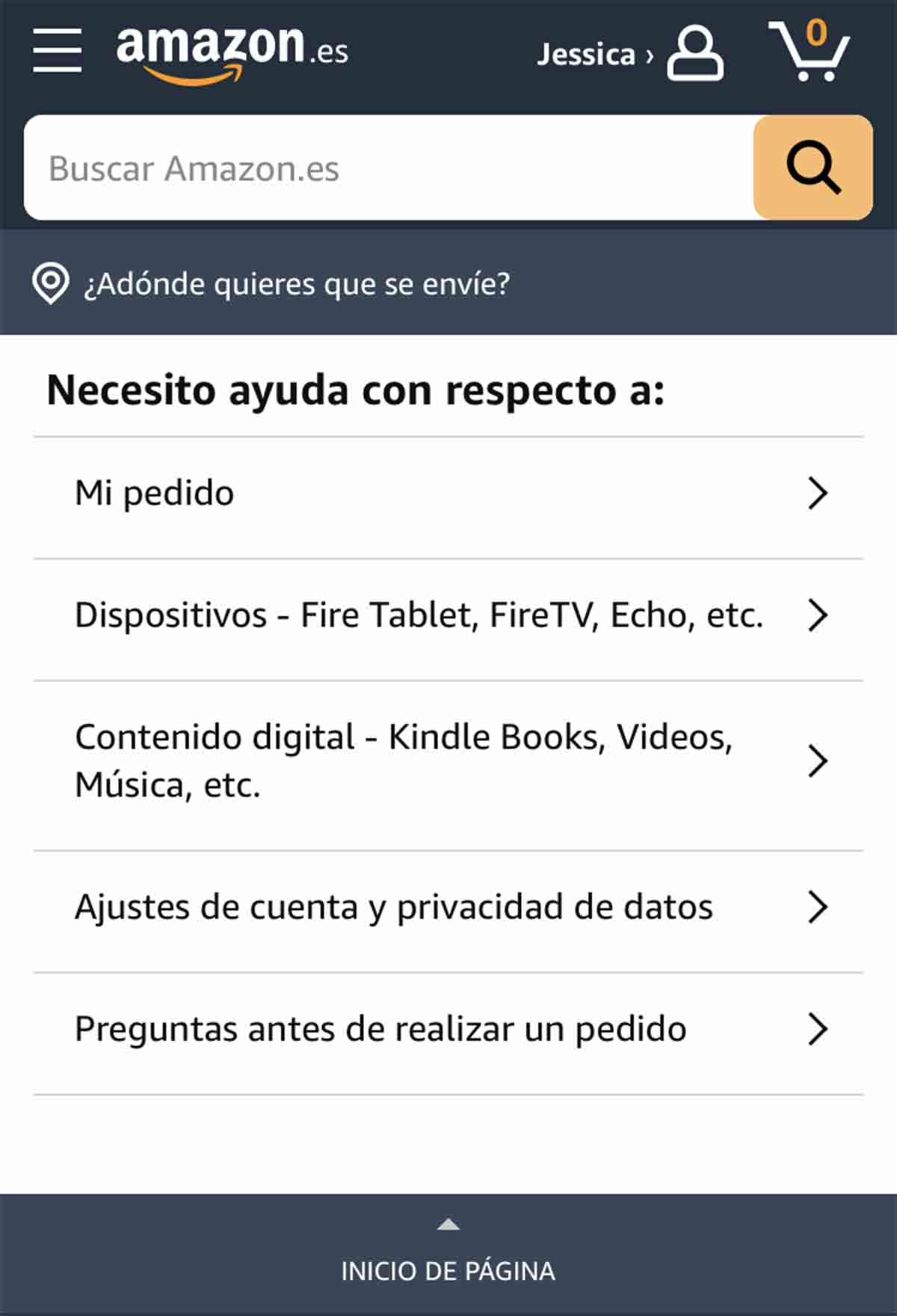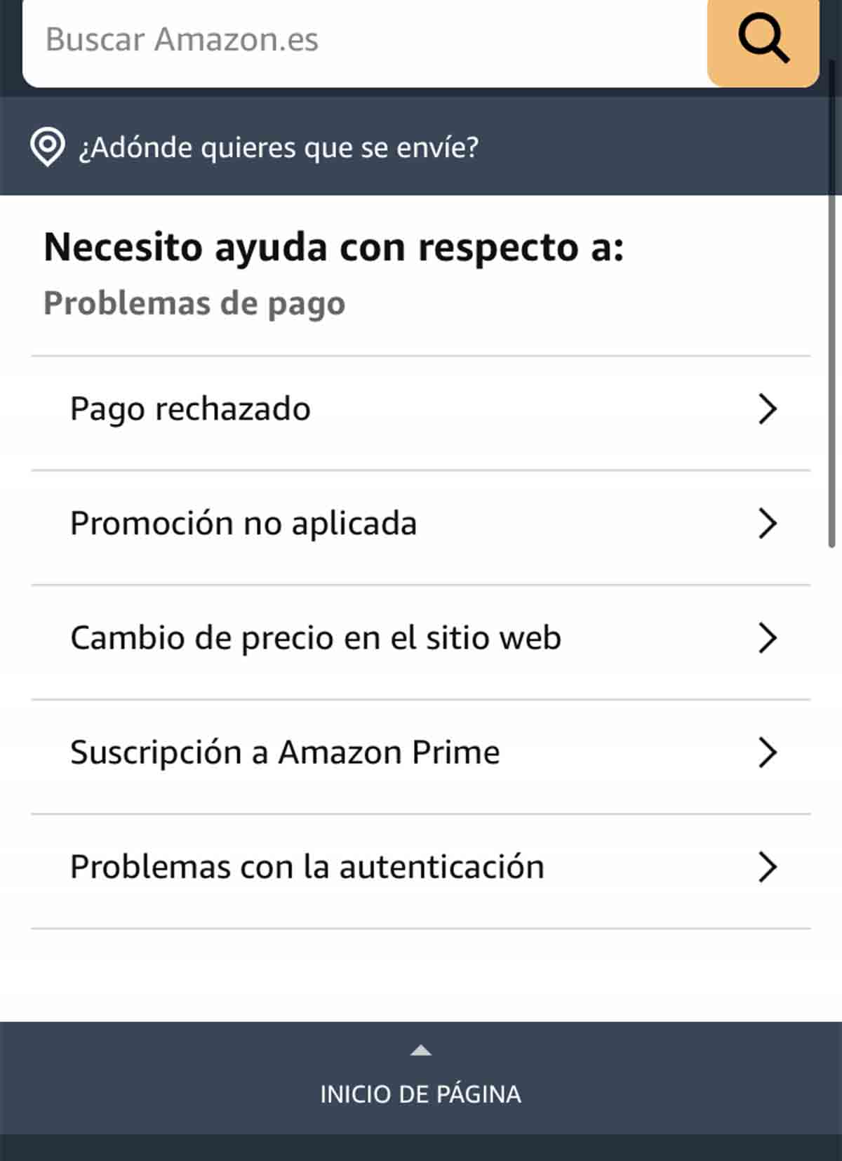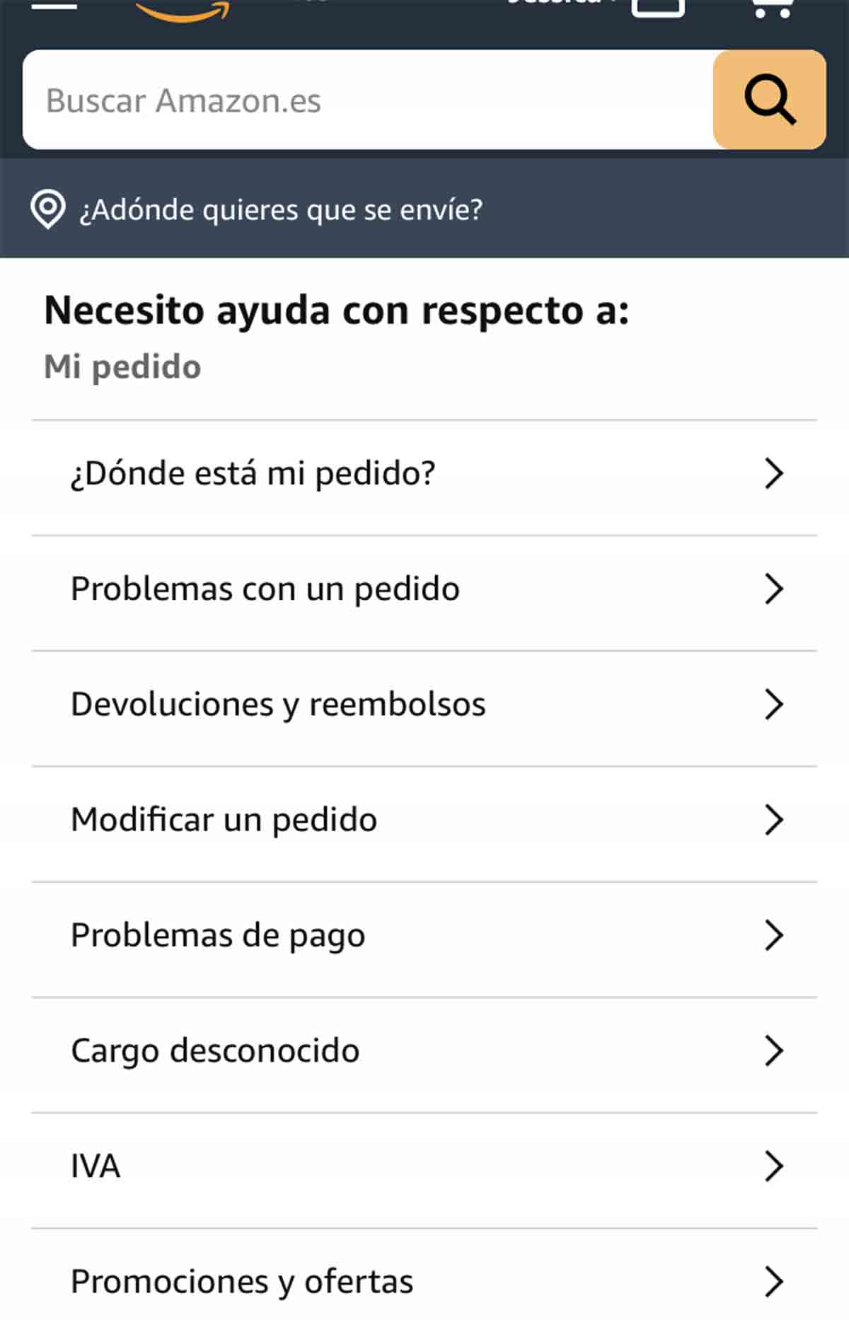 Tienes que seleccionar la pestaña que esté más relacionada con el motivo de tu consulta. Independientemente del motivo que selecciones, Amazon va a realizarte un par de preguntas más para poder derivarte de forma concreta con un trabajador sabiendo previamente qué tipo de problema tienes.