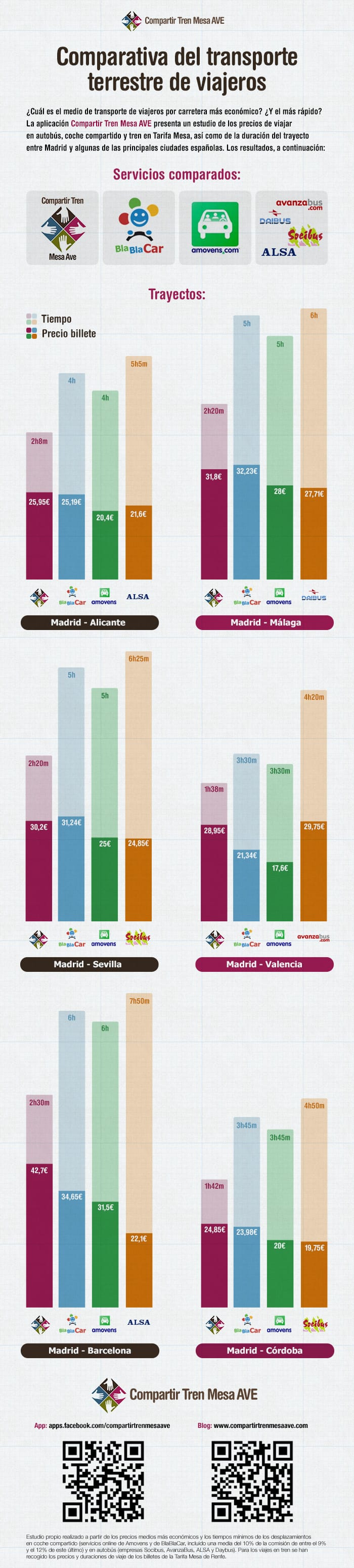 Por último, para trayectos en tren se han reflejado los precios de billetes para la tarifa Mesa de Renfe que cuentan con un 60 % de descuento sobre la tarifa estándar. Igualmente, viajando en tren también se pueden encontrar tarifas con un 70 % de descuento, pero tanto los tiempos de anticipación en la compra así como su disponibilidad no se pueden garantizar con un mínimo razonable de éxito en la compra. Los tiempos de trayecto reflejados en el análisis siempre son los ofrecidos por los propios proveedores del servicio de transporte de viajeros en sus páginas web donde se compran los billetes. Para el caso de los coches compartidos, se estiman los tiempos medios respetando los límites de velocidad y una conducción segura y razonable.