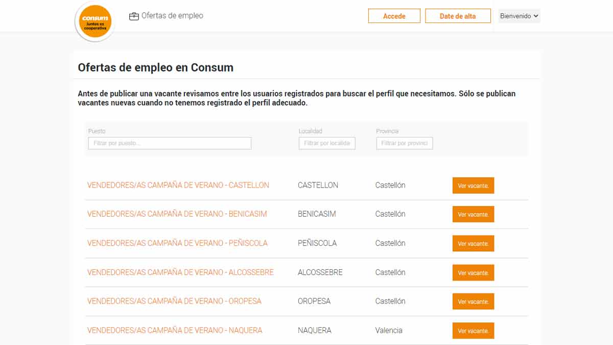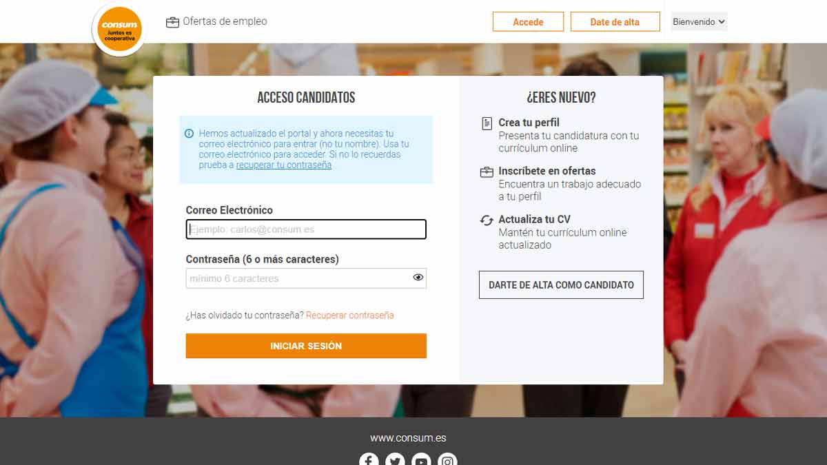Para poder acceder a un puesto de empleo en Consum hay que registrarse y enviar el currículum a través de su portal de empleo al que puedes acceder desde este enlace.