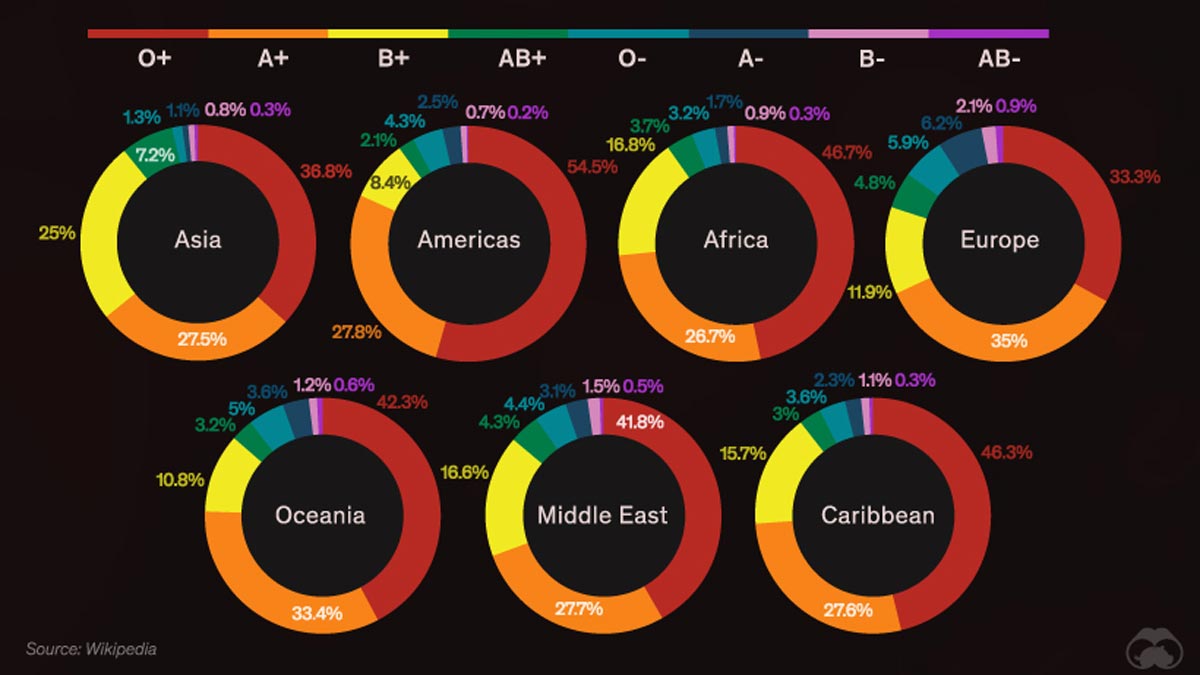 De los ocho grupos sanguíneos que establece la clasificación, a nivel mundial, el más común es el 0+, que es el que tiene el 39 % de la población del mundo y que se incluyen en el mapa elaborado por Visual Capitalist que puedes ver a continuación.