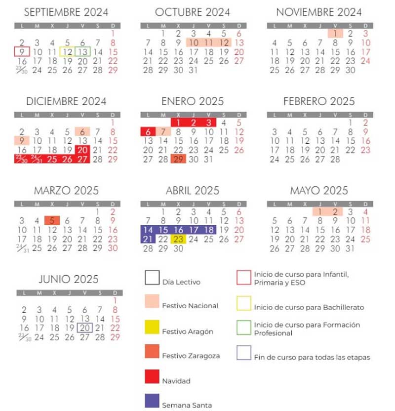 Las clases en Aragón comienzan el día 9 de septiembre en los cursos de educación Infantil, Primaria y Secundaria (ESO). Mientras que los cursos de Bachillerato empiezan el día 12 de septiembre.