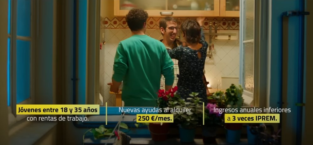 La descripción de la campaña habla de que “el bono alquiler joven es la nueva ayuda para jóvenes trabajadores que puedan cumplir su deseo de emanciparse y el de sus padres”. Un mensaje que transmiten en un tono muy liviano para la gravedad de quienes no pueden emanciparse o de la gran cantidad de personas que necesitan alquileres asequibles.