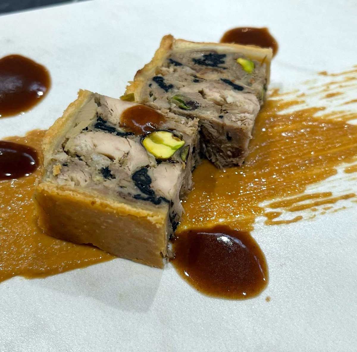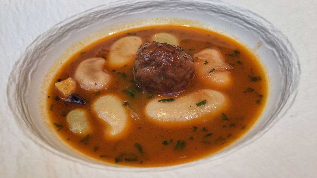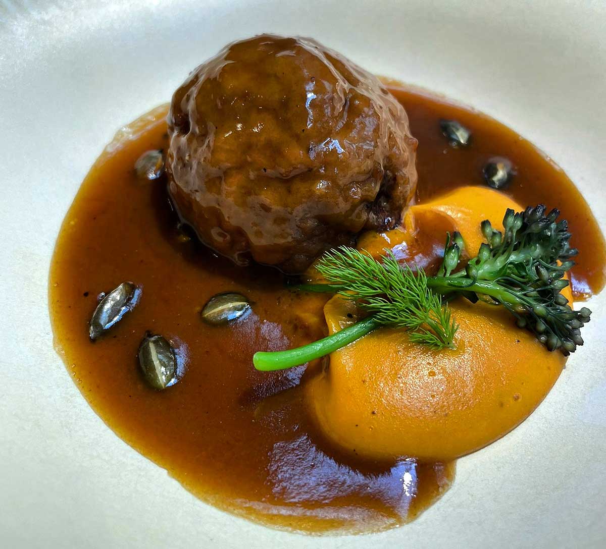- Albóndiga de venado y cerdo ibérico con núcleo de cacao y jengibre.