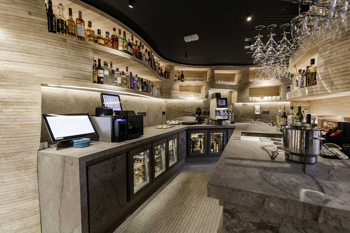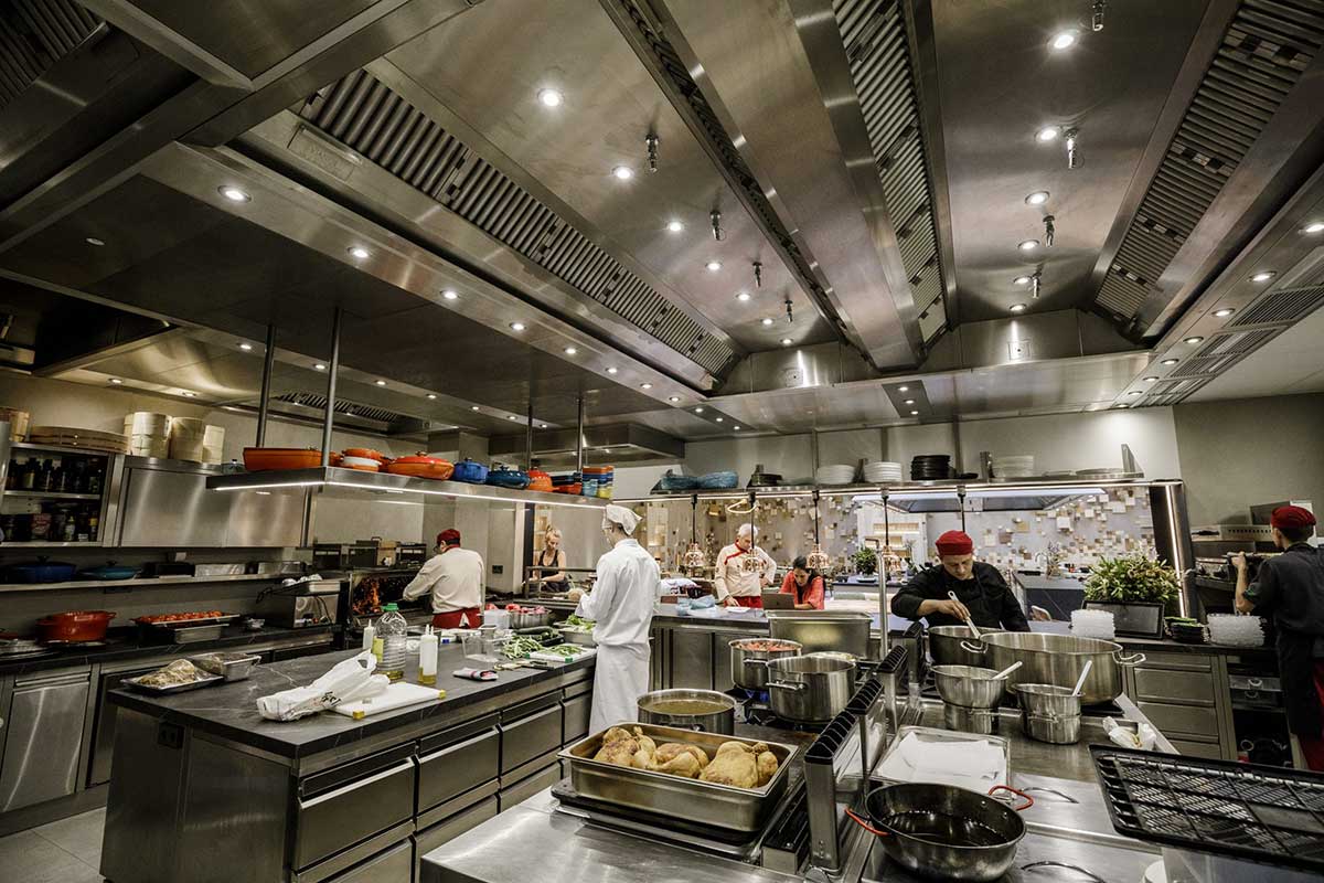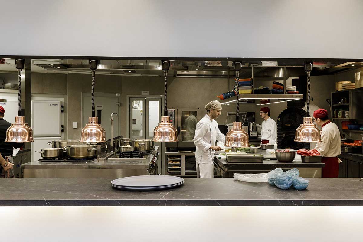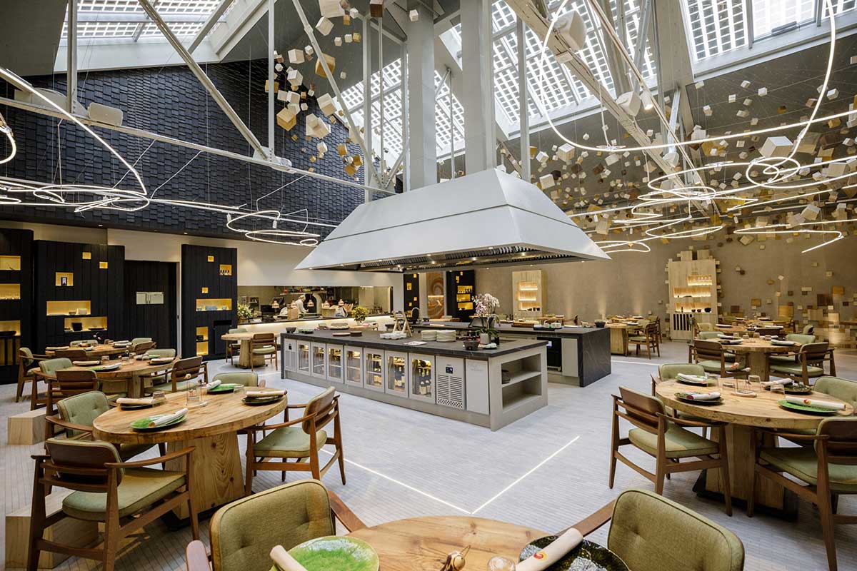 En el centro del comedor principal hay una barra abierta al público, donde se terminan algunos platos y alrededor, se encuentran las mesas de los comensales.
