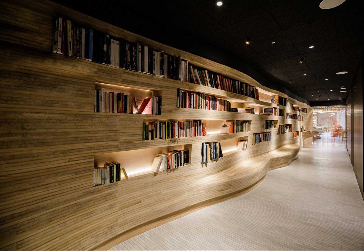 A la entrada, el comensal puede disfrutar de un pasillo biblioteca donde se encuentran una infinidad de títulos de libros de cocina y de recetas seleccionados con especial detalle y cuidado.