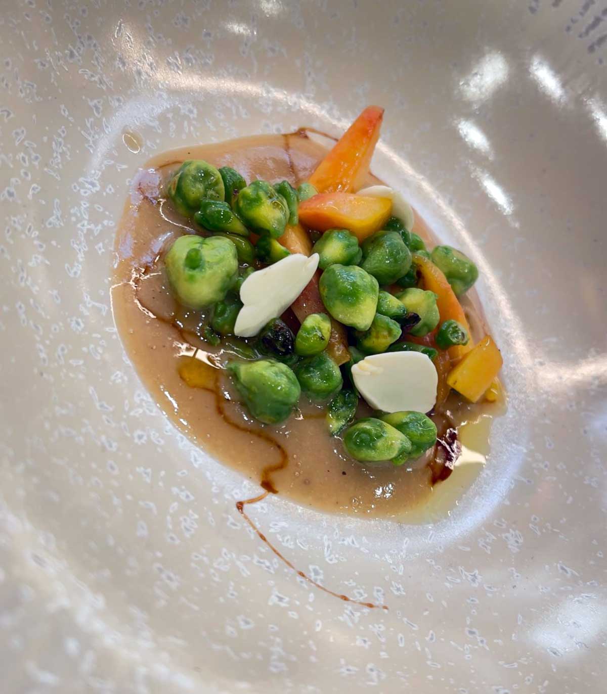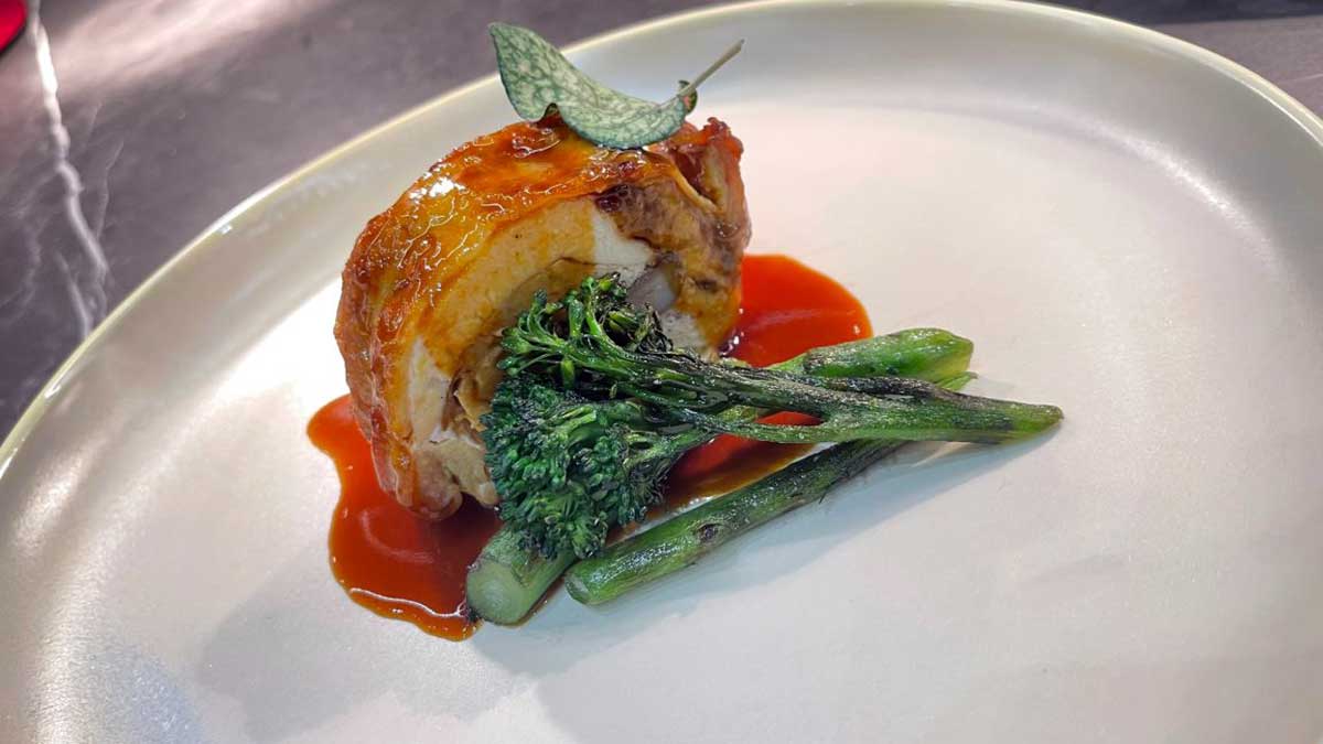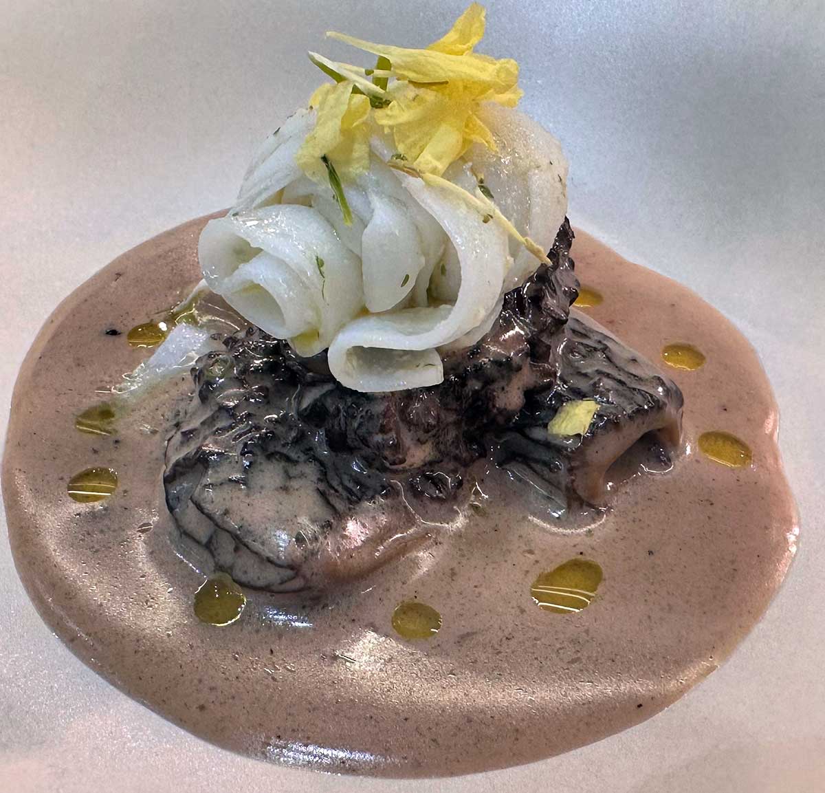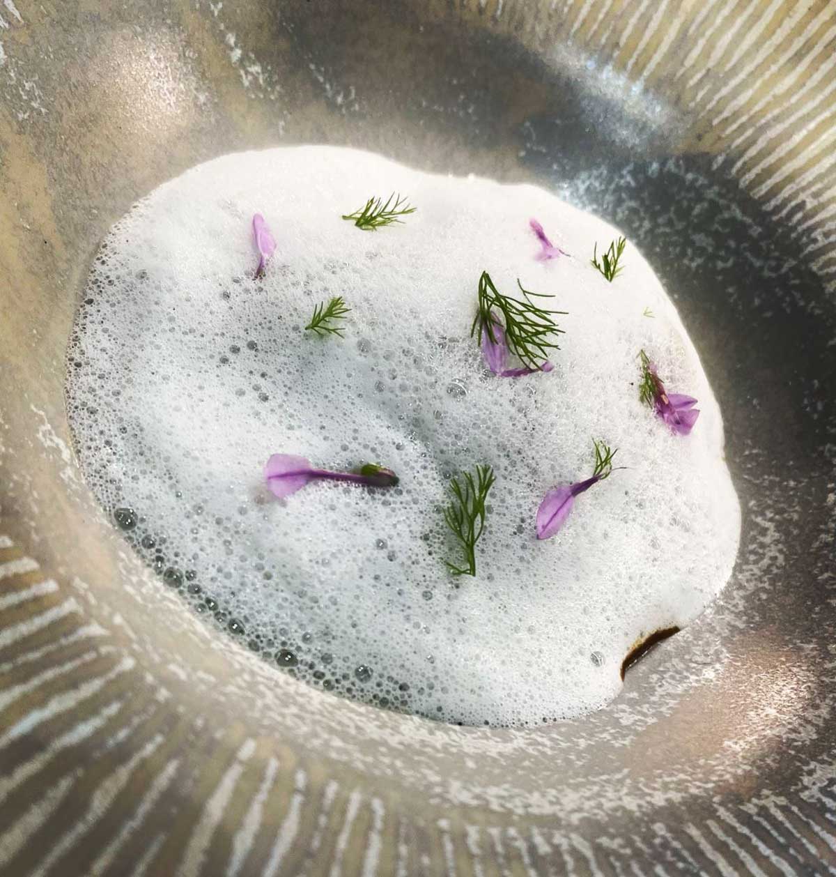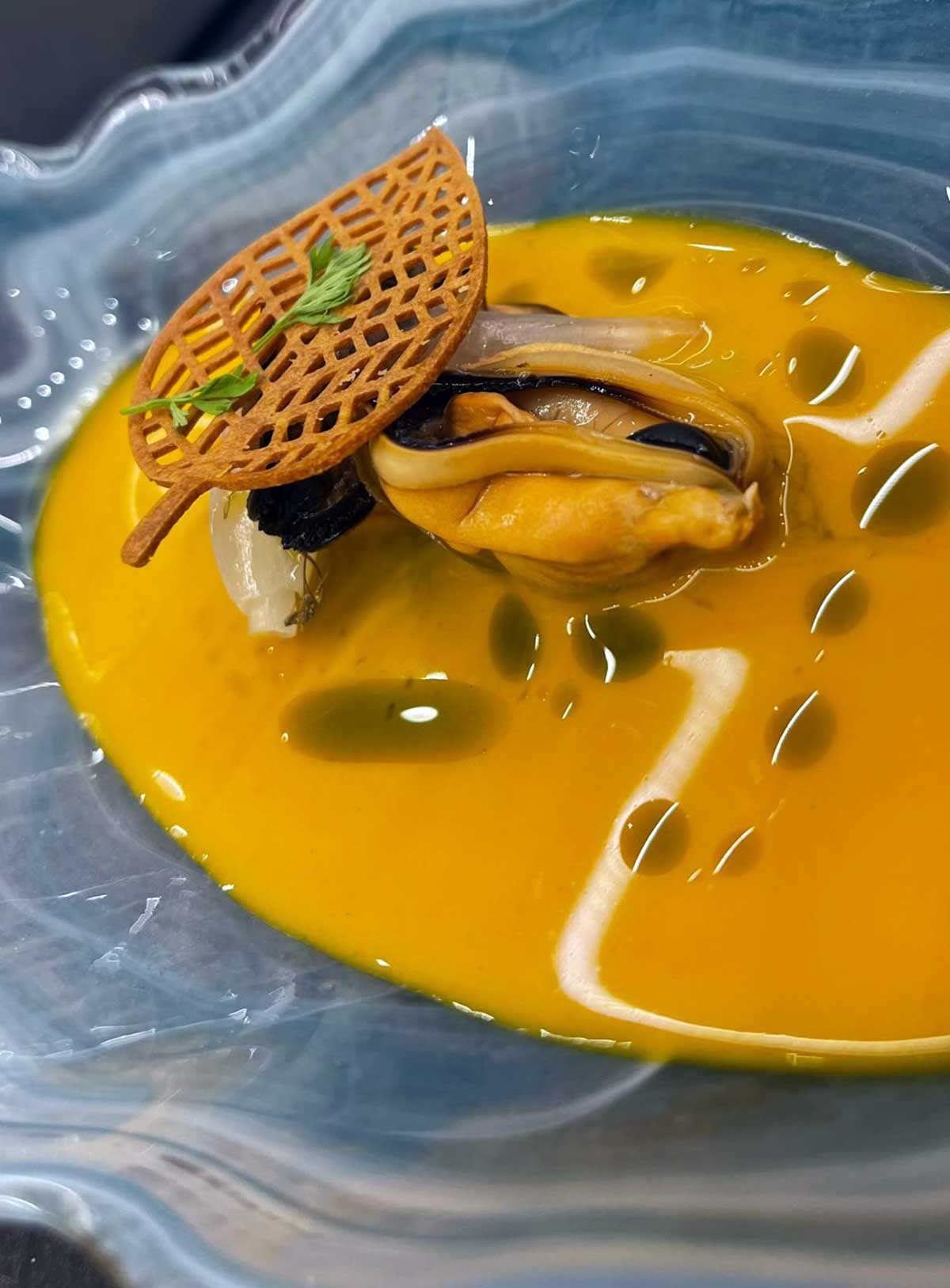 - Aire de queso parmesano gallego que cubre un canelón de pollo de campo con curry a la japonesa.