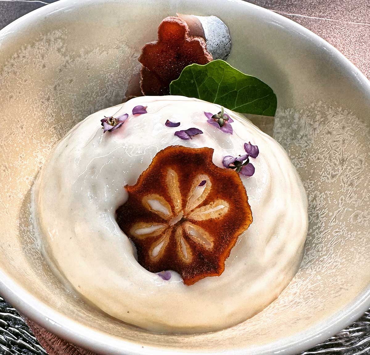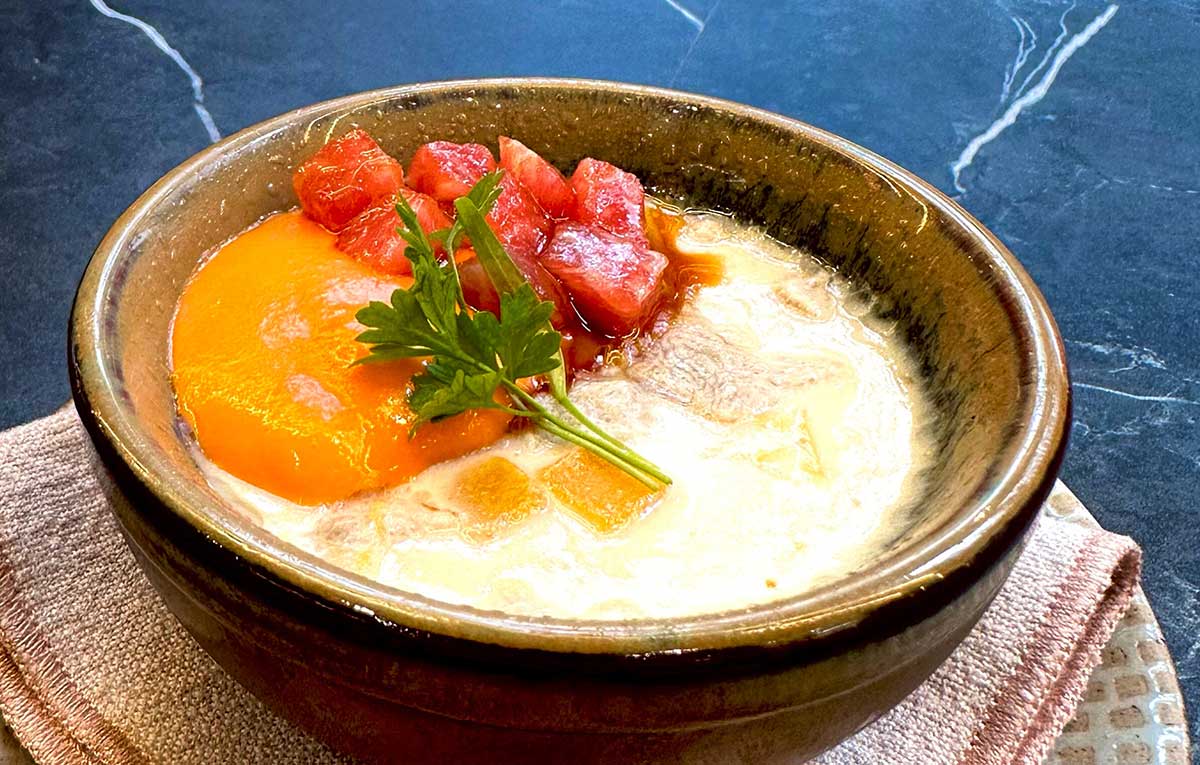 - Ajoblanco esponjoso de chufas, Hosigaki tradicional japonés, caviar de salmón y caballa marinada