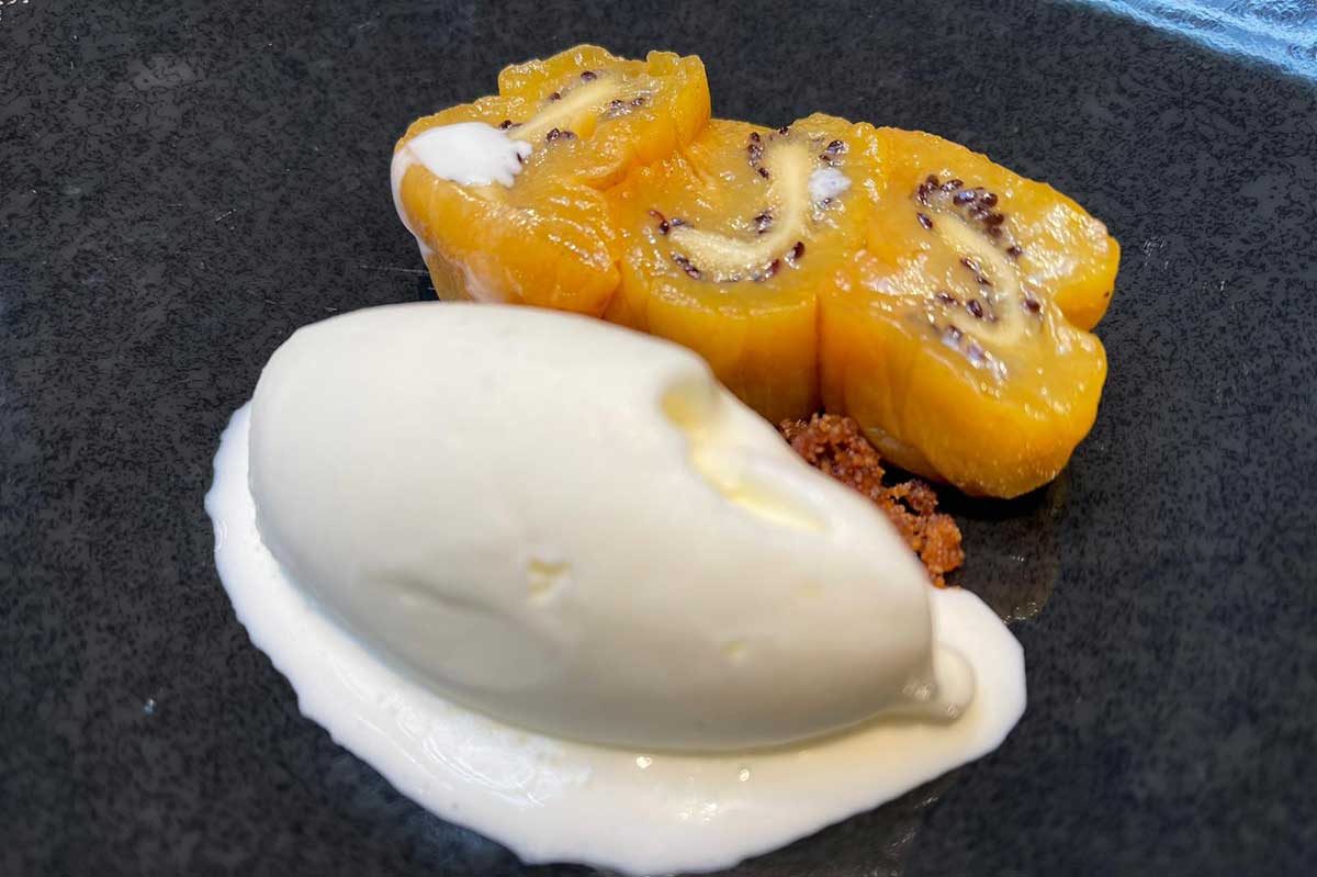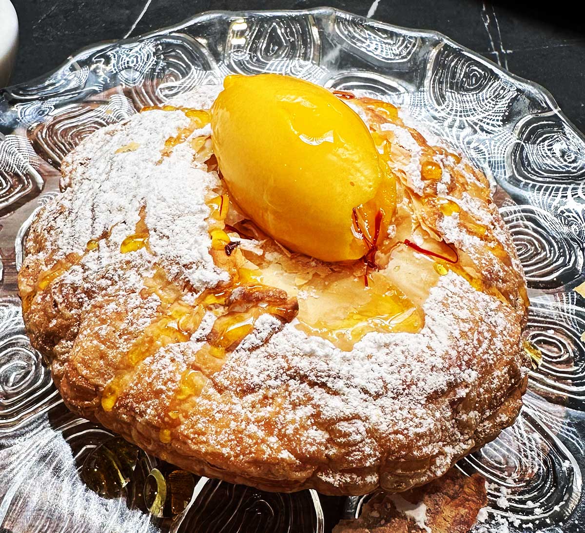 - También la Paratha rellena de crema de mascarpone de sorbete de mang y salsa de azafrán.