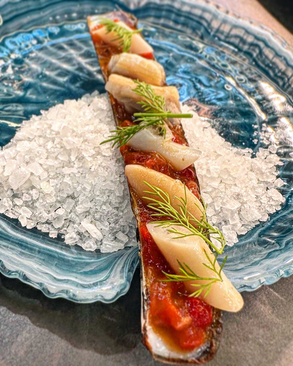 - Navajas gallegas salteadas en aceite de ajos con una picada de pimientos de cristal y fresas
