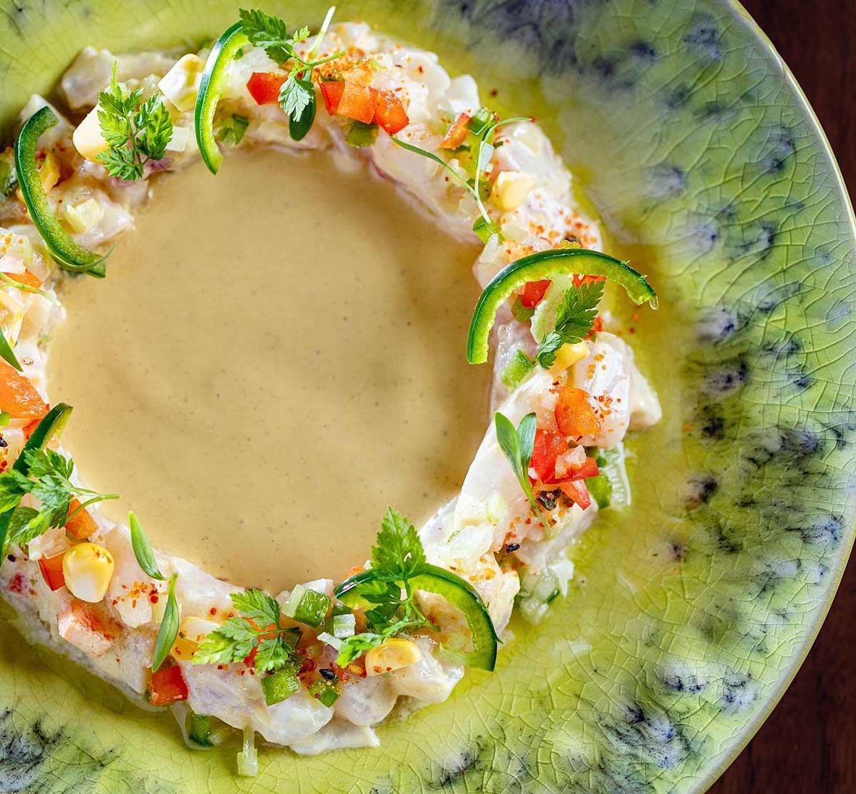 - Ceviche amarillo de corvina, maíz fresco y seco, manzana verde y jalapeños por 18 euros.