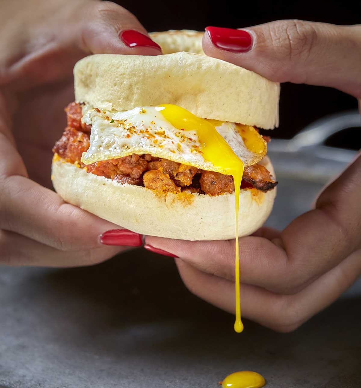- Brioche cojonudo desmigado de chorizo de Ronda, cebolla dulce, salsa chipotle y huevo frito de codorniz por 7 euros.