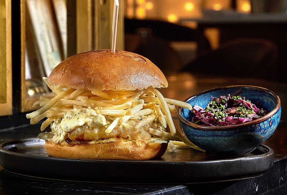 - Hamburguesa de corvina marinada, patatas fritas, salsa tártara y coleslaw de col morada por 19 euros.