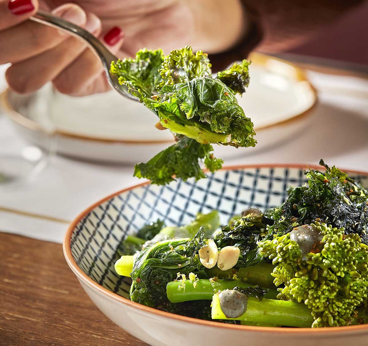 - Ensalada de Bimi y Kale. La verdura más sana del mundo y Kale, aliñada con mostaza y miel de flores, cacahuetes y sésamo por 14 euros.