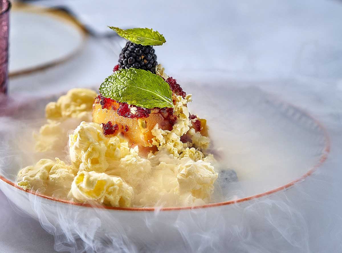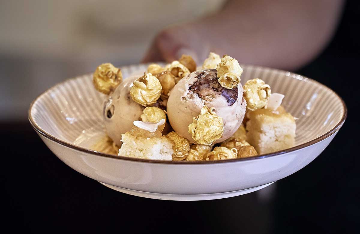 - Helado de Nutella rebozado en palomitas y avellanas, cremoso de caramelo, bizcocho de coco y mermelada de limón por 12 euros.