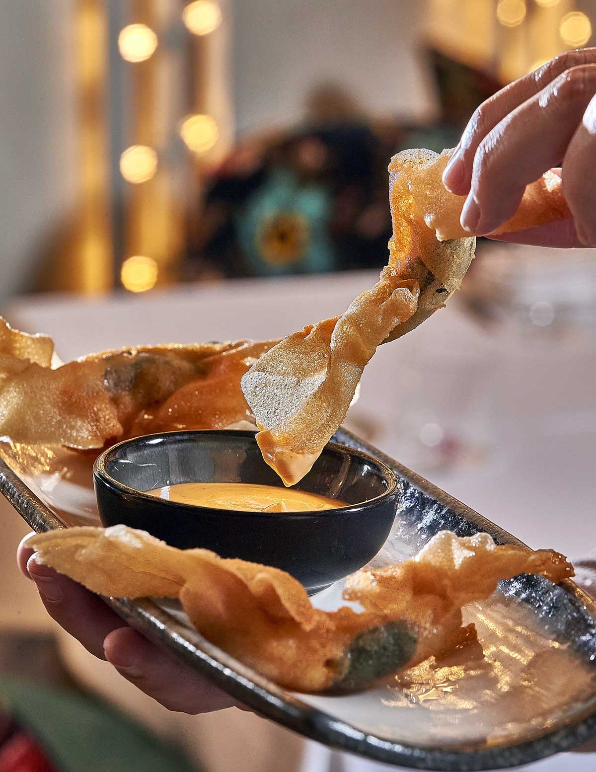 - Langostinos en tempura empapados en nuestra salsa especial DG y hojas de acedera por 26 euros.
