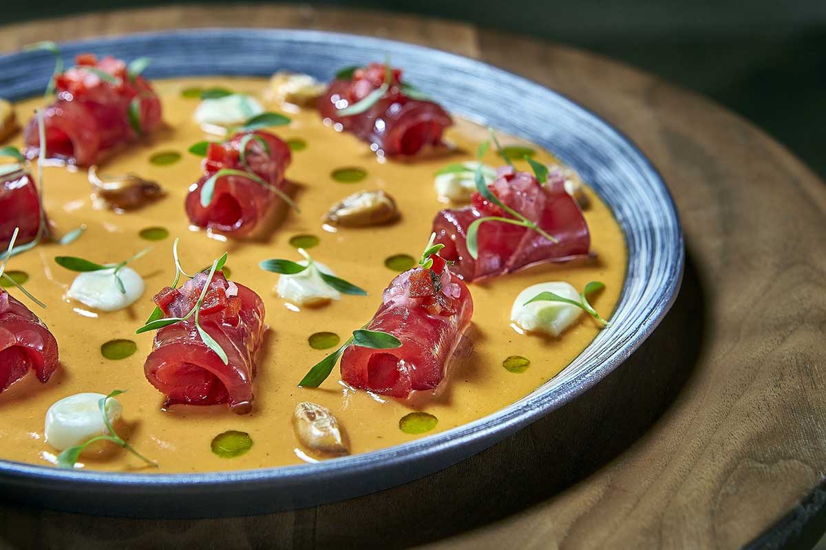 - Sashimi de atún de almadraba en adobo. Descargamento de atún en adobo, pipirrana peruana, maiz cancha y cilantro joven por 22 euros.