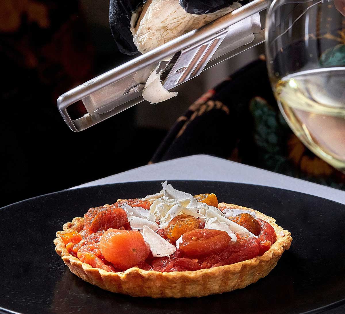- Tarta tatín de tomate semiseco, albahaca fresca y cacio e pepe helado por 15 euros.