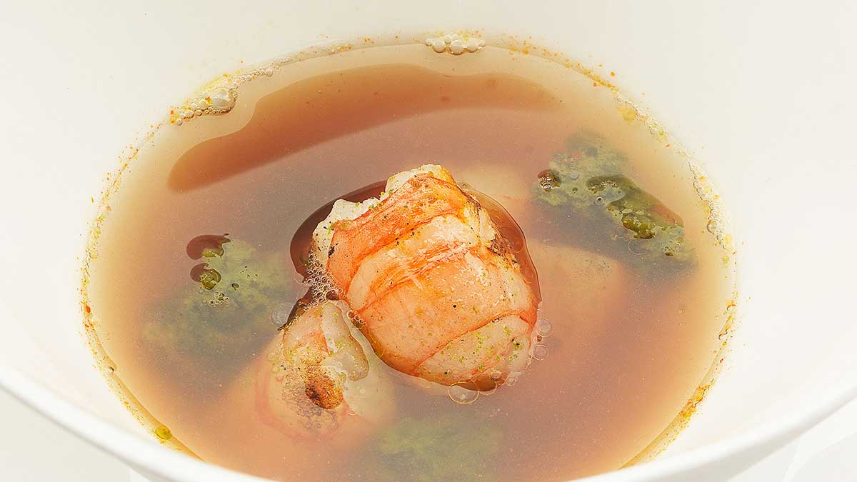 - Gazpachuelo de cebolletas a modo de ceviche con bogavante y mejillones