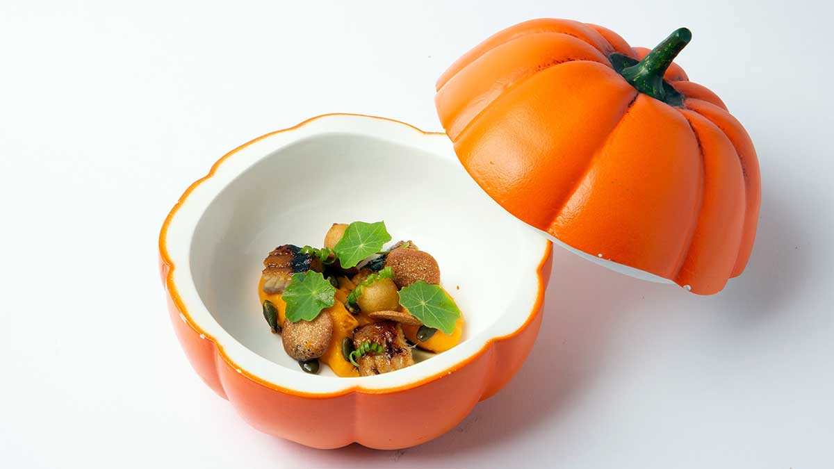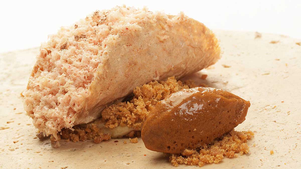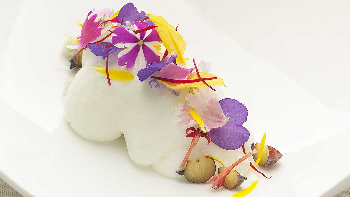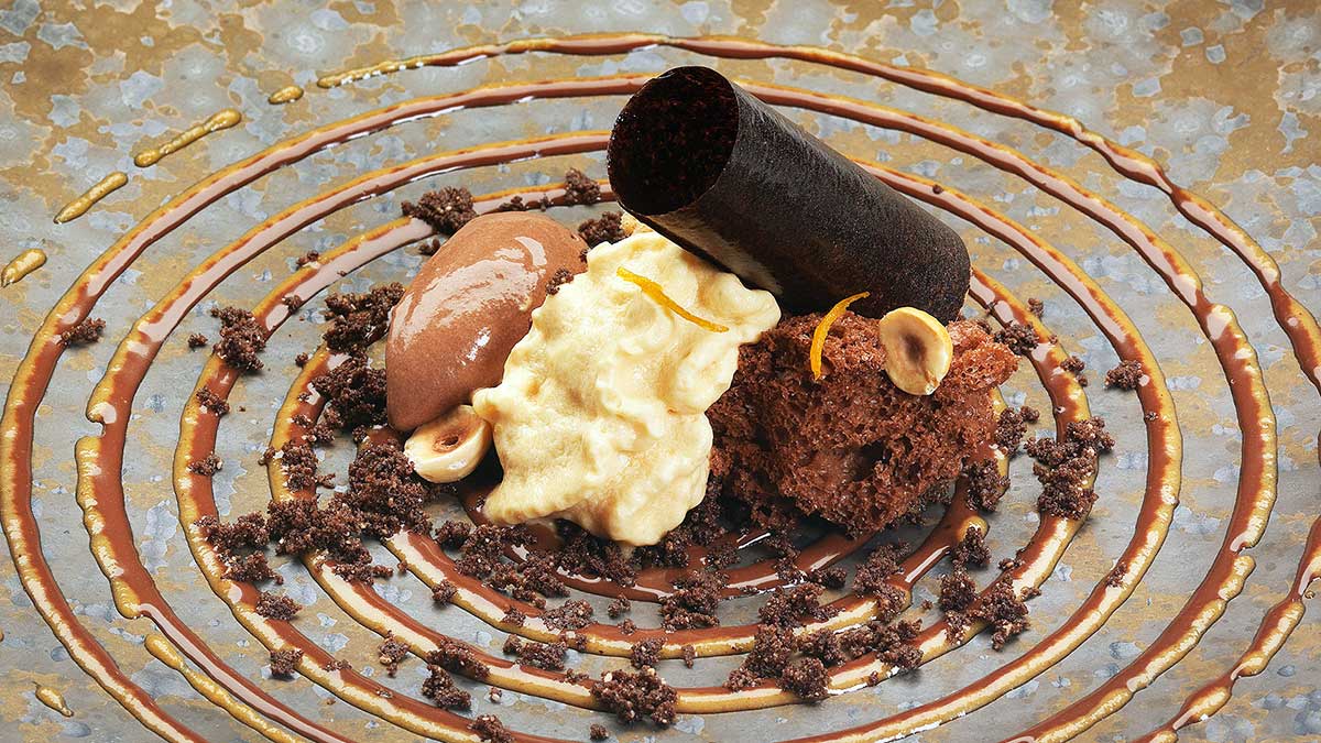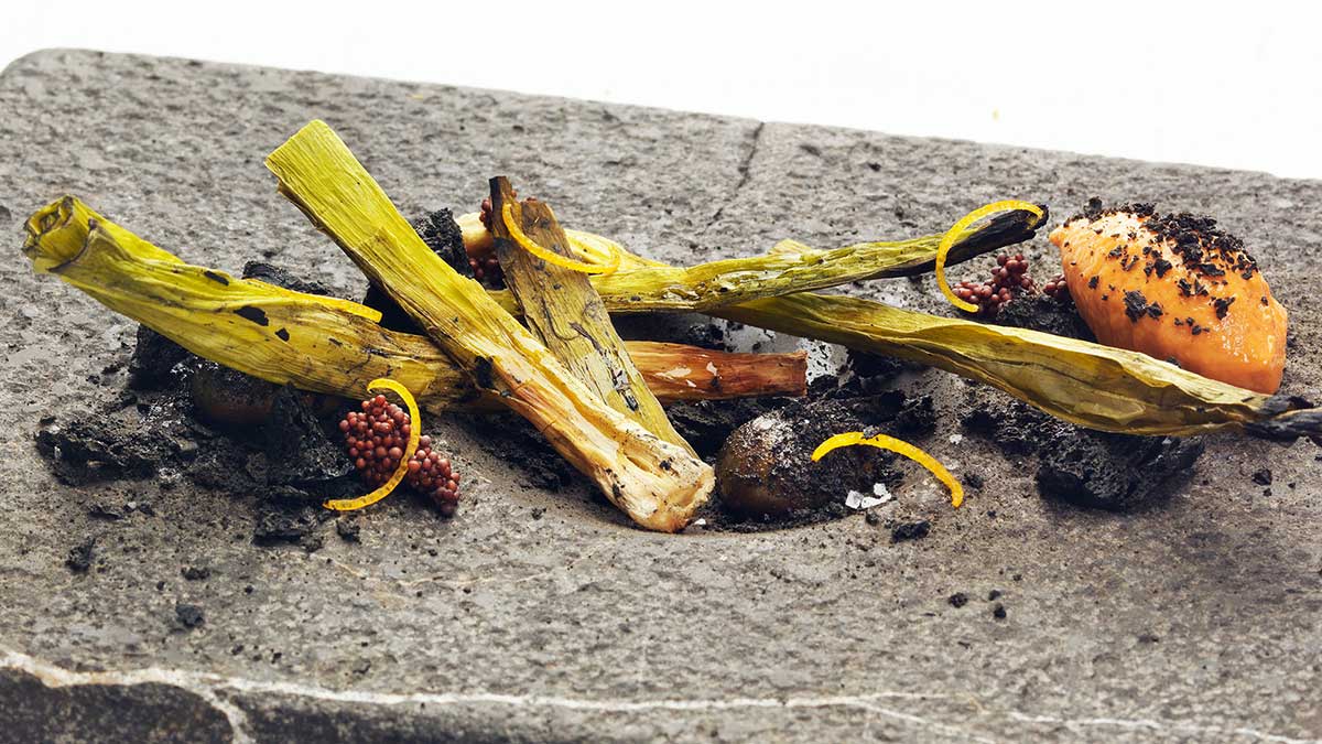 - Raíces, semillas y cortezas calcinadas, raíz de perifollo helada al bourbon, escamorza ahumada y trufas conservadas
