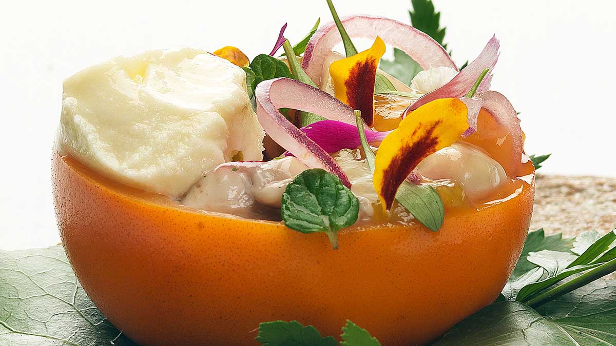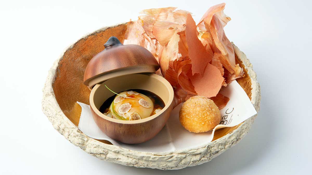 - Agua de cebollas concentradas, huevo de pollita ahumado, clara satay y hojaldre de cebolla al brie trufado