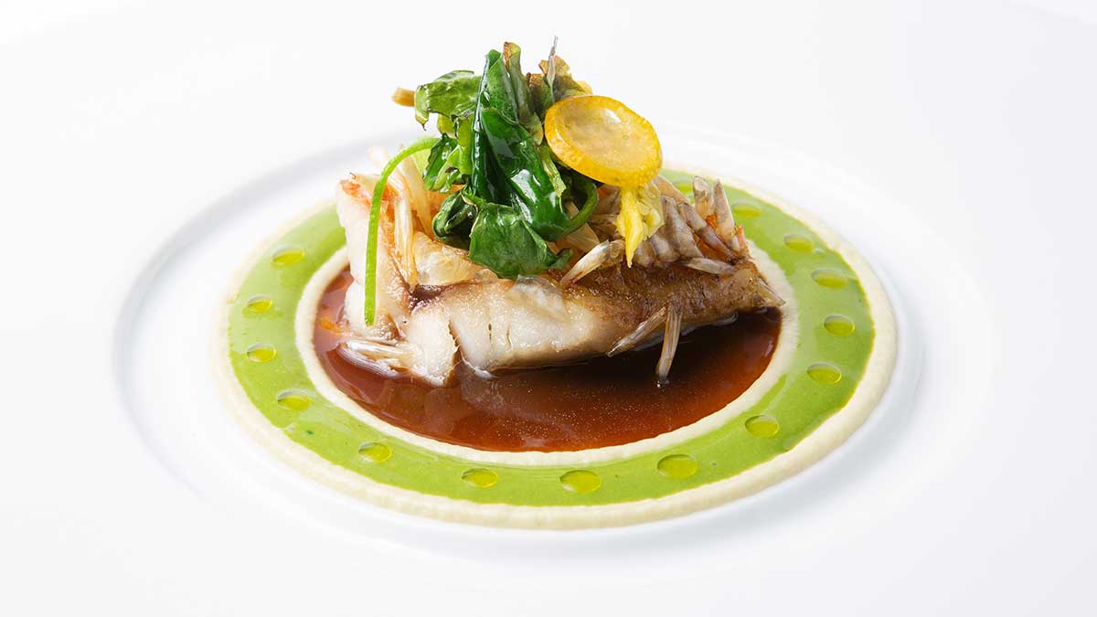 - Merluza con pil pil de sus proteínas con romana vegetal, salsa verde y berberechos tigre