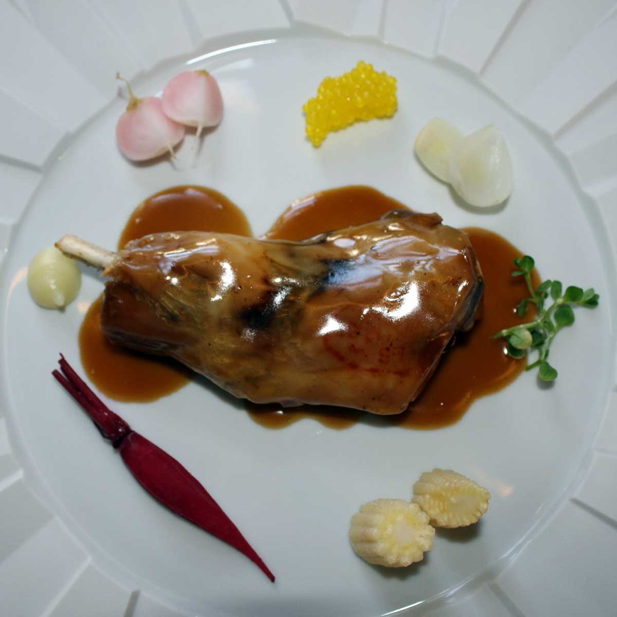 - Paletilla de Cabrito Lechal con encurtidos y brotes frescos
