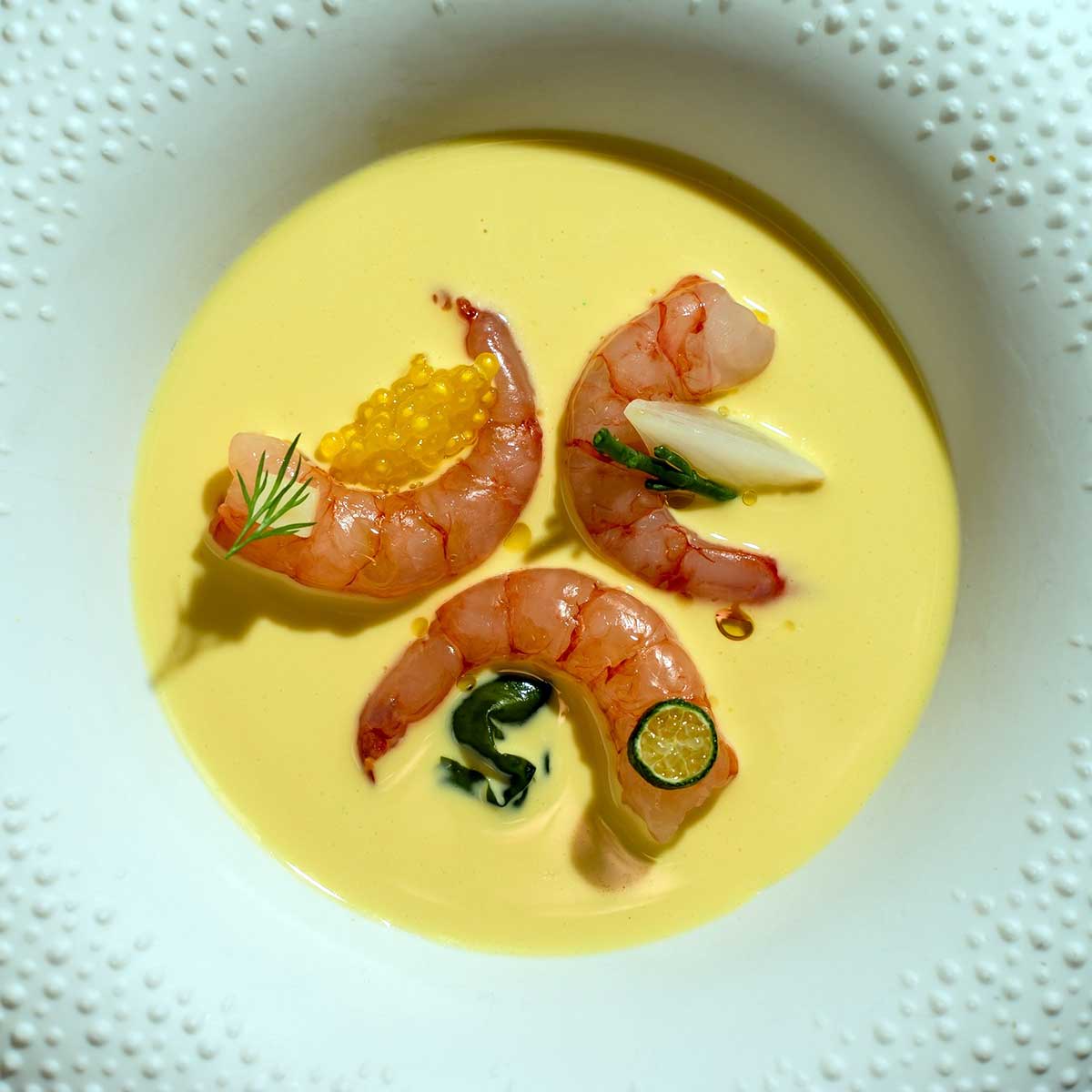 - Consomé de galera y yuzu con tosta de erizo