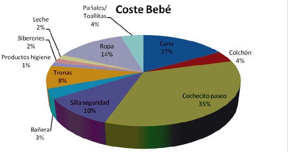 Las partidas más importantes a la hora de plantear el presupuesto son el cochecito de paseo, la cuna, la silla de seguridad del coche y la ropa, que se llevan el 82 % del coste total. El precio del cochecito de paseo oscila entre los 390 y los 931 euros, y en éste hay que valorar si se adapta a las diferentes fases de crecimiento del bebé, si incluye un cuco para las primeros meses y si después se convierte en silla de pasea. Además, hay opciones que incluyen la silla de seguridad para el vehículo que puede rebajar el coste final del nacimiento. El precio de las cunas incluyendo el colchón oscila entre los 155 y los 637 € de media. En ellas ocurre lo mismo que con los carritos, las hay que se convierten en camas, por lo que aunque su precio inicial es un poco más elevado, a la larga se consigue un ahorro.