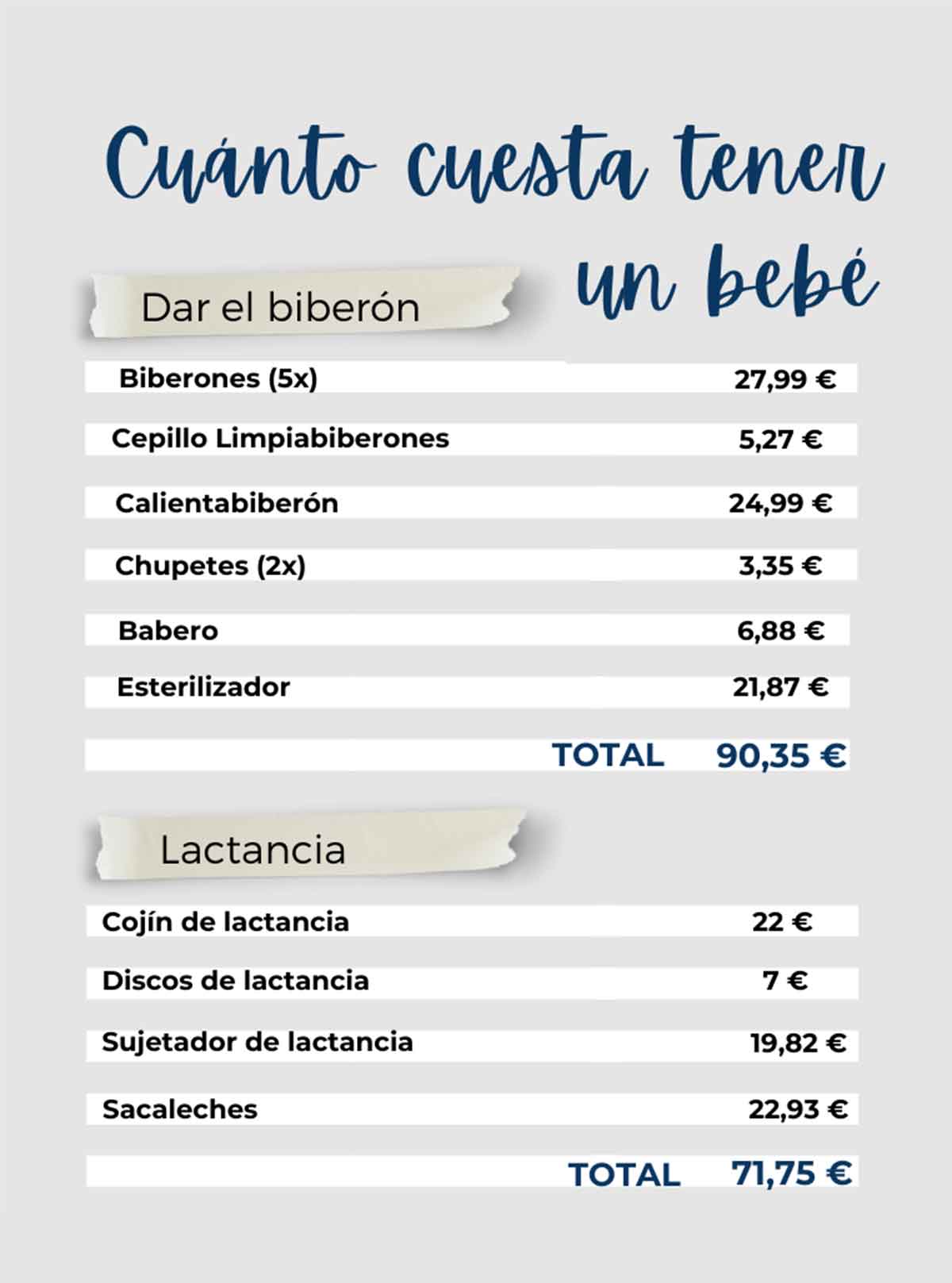 En cuanto a la lactancia, la partida de gasto total es de 71,75 euros. De una manera más detallada, los gastos son: