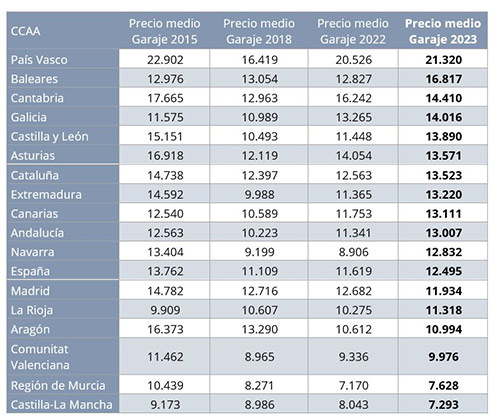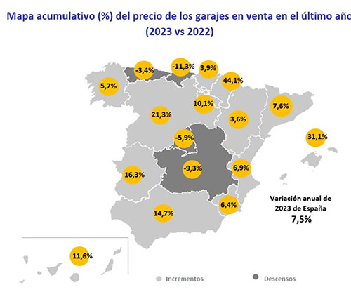 Por otra parte, la zona donde más ha subido ha sido en Navarra, con un aumento del 44,1 % en el precio medio de las plazas de garaje. Le sigue Baleares, con un aumento del 33,1 % en el precio, y Castilla y León, con una subida del 21,3 %.