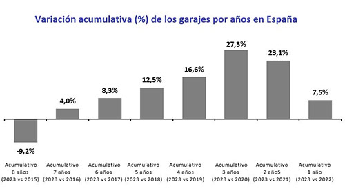 El informe de Fotocasa evidencia que el precio de los garajes que se venden en España durante 2023 se ha incrementado en un 7,5 %. Una cifra que sitúa el coste medio de adquisición de este activo en 12.495 euros. Dato que, si se compara con el coste de los garajes hace cinco años, supone un incremento de 12,5 %.