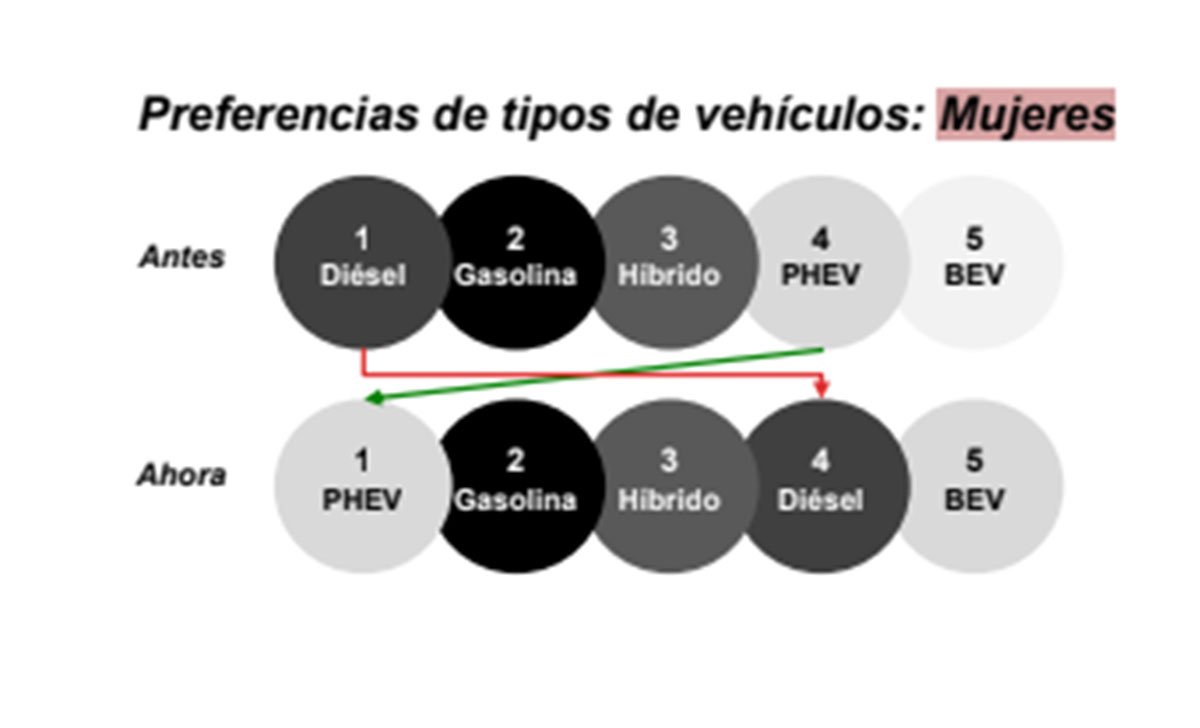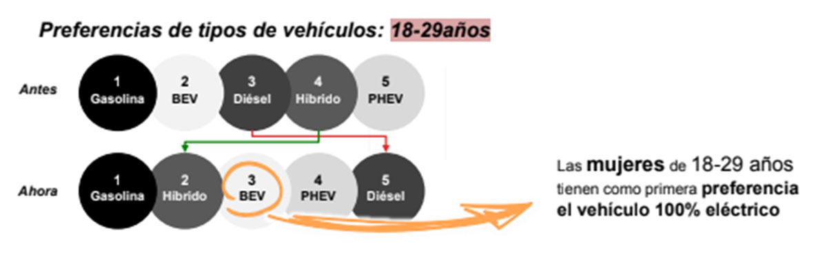 Sí que cambia el segundo puesto, en el que antes del modelo eléctrico se situaba como segunda opción favorita y, en la actualidad, queda desplazado por el modelo híbrido. Aunque el eléctrico queda relegado a última posición, las mujeres consultadas de entre 18 y 29 años apuestan por este tipo de vehículo 100 % eléctrico como preferencia de compra.