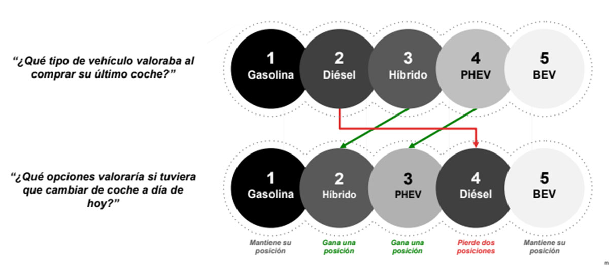 Antes, en la compra de su último coche, encabezaba la lista el vehículo diesel, seguido del de gasolina. Mientras que en la actualidad, el primer puesto lo ocupa el vehículo 100 % eléctrico y le sigue el de gasolina.