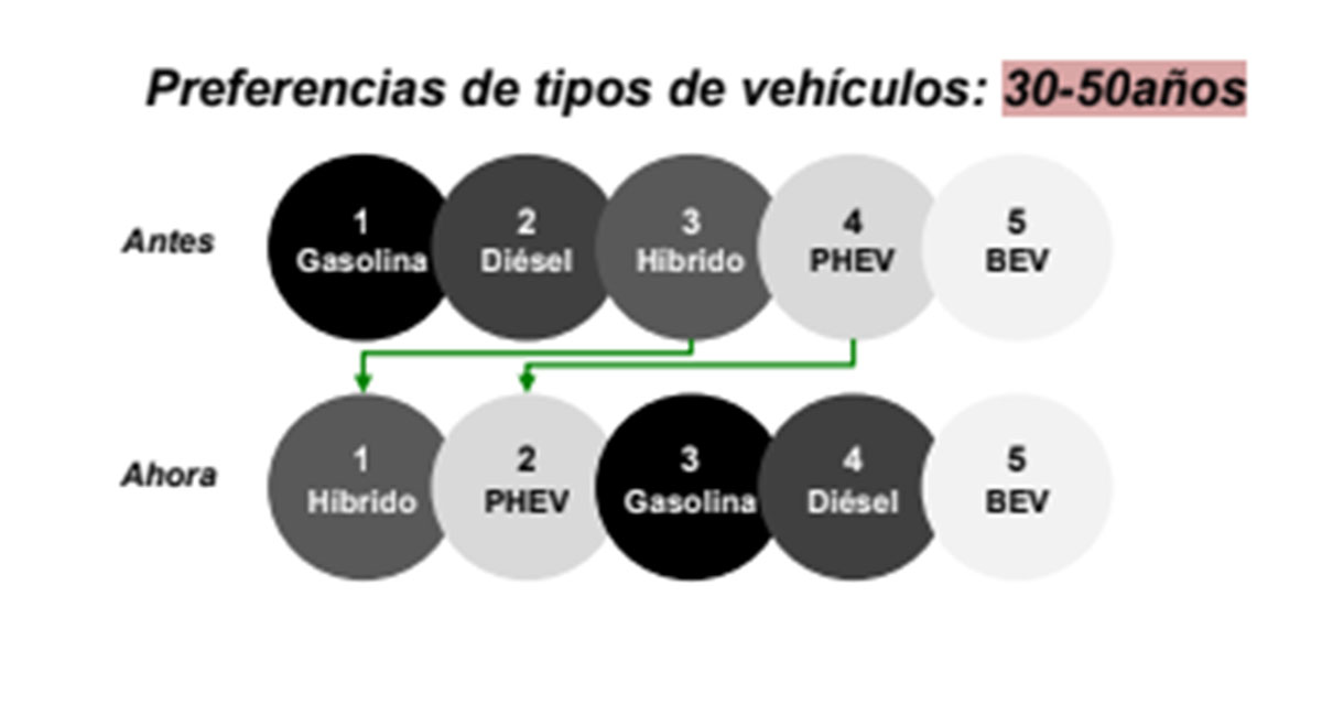 Los adultos con una edad comprendida entre 30 y 50 años prefieren los coches híbridos, seguidos en segunda posición por los 100 % eléctricos. Situación que, en la compra de su último coche, era totalmente distinta. Porque las preferencias en ese momento pasaban, en primer lugar, por un modelo de gasolina y, como segunda opción, en uno de diesel.