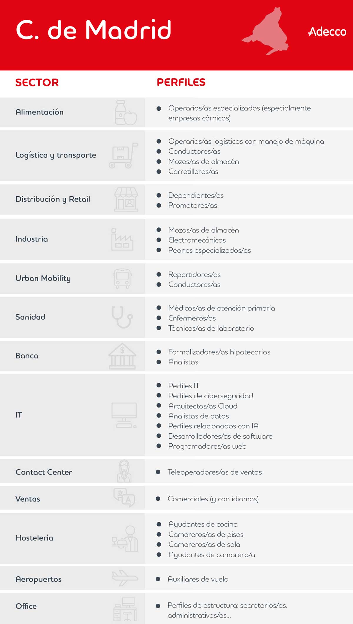 ¿Cuáles son los perfiles profesionales más buscados? Dependiendo de la zona de España en la que busques trabajo, la oferta se centra en la búsqueda de determinados perfiles profesionales. Por ejemplo, en la Comunidad de Madrid falta personal que trabaje en una amplia variedad de sectores, como en el tecnológico, en el ámbito sanitario, en el sector industrial, agroalimentario, en la logística y el transporte, así como en el sector bancario, ventas y hostelería, entre otros.
