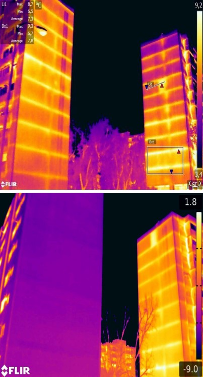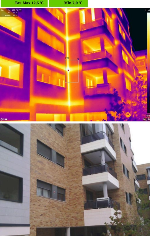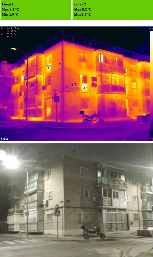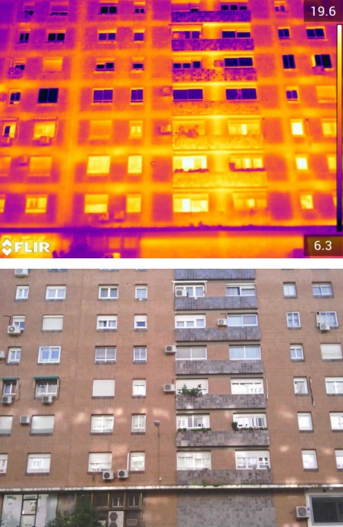 Como ejemplo final, un caso claro del antes y después de una rehabilitación de un edificio tras aislarlo con SATE. Es un edificio del madrileño barrio de Orcasitas y donde se aprecia el color anaranjado antes de la reforma en sus paredes y muy evidente en el frente de forjado, frente al evidente aislamiento que denota el color morado en toda la fachada, con el consiguiente ahorro térmico y en la factura para todos sus vecinos.