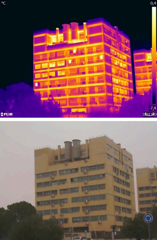 Este edificio de los años 80 en Barajas, Madrid, con una imagen térmica tomada a principios de enero, revela una pérdida de energía evidente. Se ve el radiador bajo la