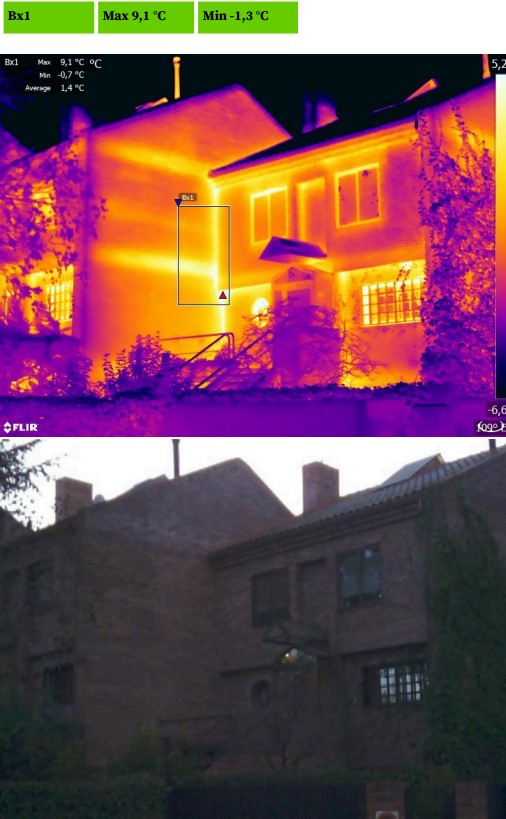 En este nuevo ejemplo, en Alcobendas, se trata de un edificio moderno construido entre los años 2005 y 2010. La fachada es de ladrillo con doble hoja y aislamiento por el interior. Se aprecia claramente el forjado —líneas horizontales amarillas— y el encuentro de la fachada —línea vertical amarilla— como puente térmico con alta temperatura superficial, en contraste con el resto de la fachada, en morado y, por tanto, sin pérdida energética.