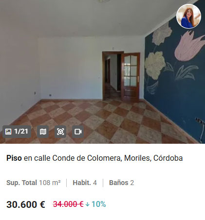 En Moriles (Córdoba) se vende este piso por 30.600 euros. La vivienda se encuentra en la segunda planta de un edificio sin ascensor y, en total, tiene una superficie construida de 108 m². El inmueble se distribuye en cuatro habitaciones, salón-comedor, cocina, dos baños y una terraza.