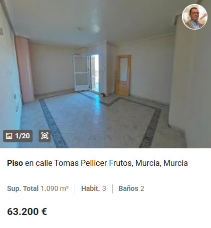 En Murcia se vende este otro piso por 63.200 euros. La vivienda distribuye todas sus estancias en dos plantas. En la planta baja cuenta con una habitación, salón-comedor, cocina, lavadero, un baño completo y balcón. La planta superior tiene dos habitaciones, un baño completo y cuenta con una terraza.