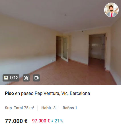 Por 77.000 euros se vende este otro piso en Vic (Barcelona). La vivienda tiene 75 m² construidos, distribuidos en tres habitaciones, salón-comedor, cocina y un aseo.