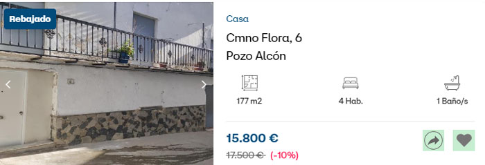 En el municipio de Pozo Alcón (Jaén) se vende esta casa por 15.800 euros y un 10 % de descuento aplicado ya en el precio. Se trata de una casa baja de 177 m² construido que necesita una rehabilitación. Cuenta con tres habitaciones, dos baños, cocina y salón-comedor.