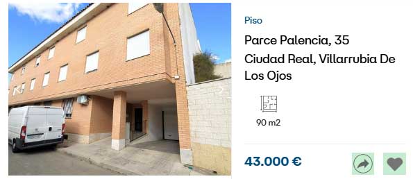En Villarrubia de los Ojos (Ciudad Real) se vende este otro piso por 43.000 euros. Se trata de un dúplex que incluye plaza de garaje. Tienen una superficie de 90 metros cuadrados construidos distribuidos en dos plantas. En la primera planta se encuentra un amplio salón-comedor, una moderna cocina equipada y un baño con plato de ducha. La segunda planta, compuesta de un distribuidor, dos dormitorios y un baño con bañera.